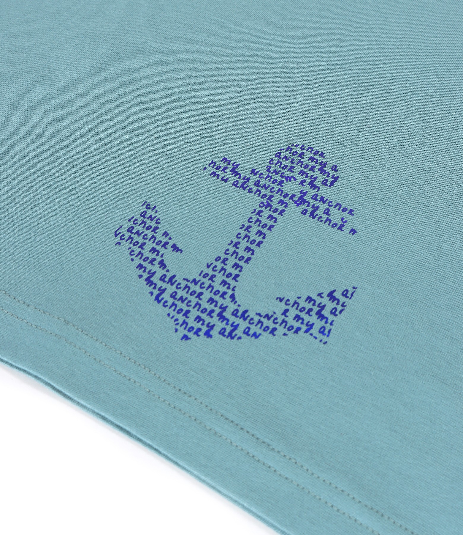 Bluza din jerse elastic uni, cu ancora decorativa in partea de jos, cu decolteu barcuta si cu umeri cazuti.