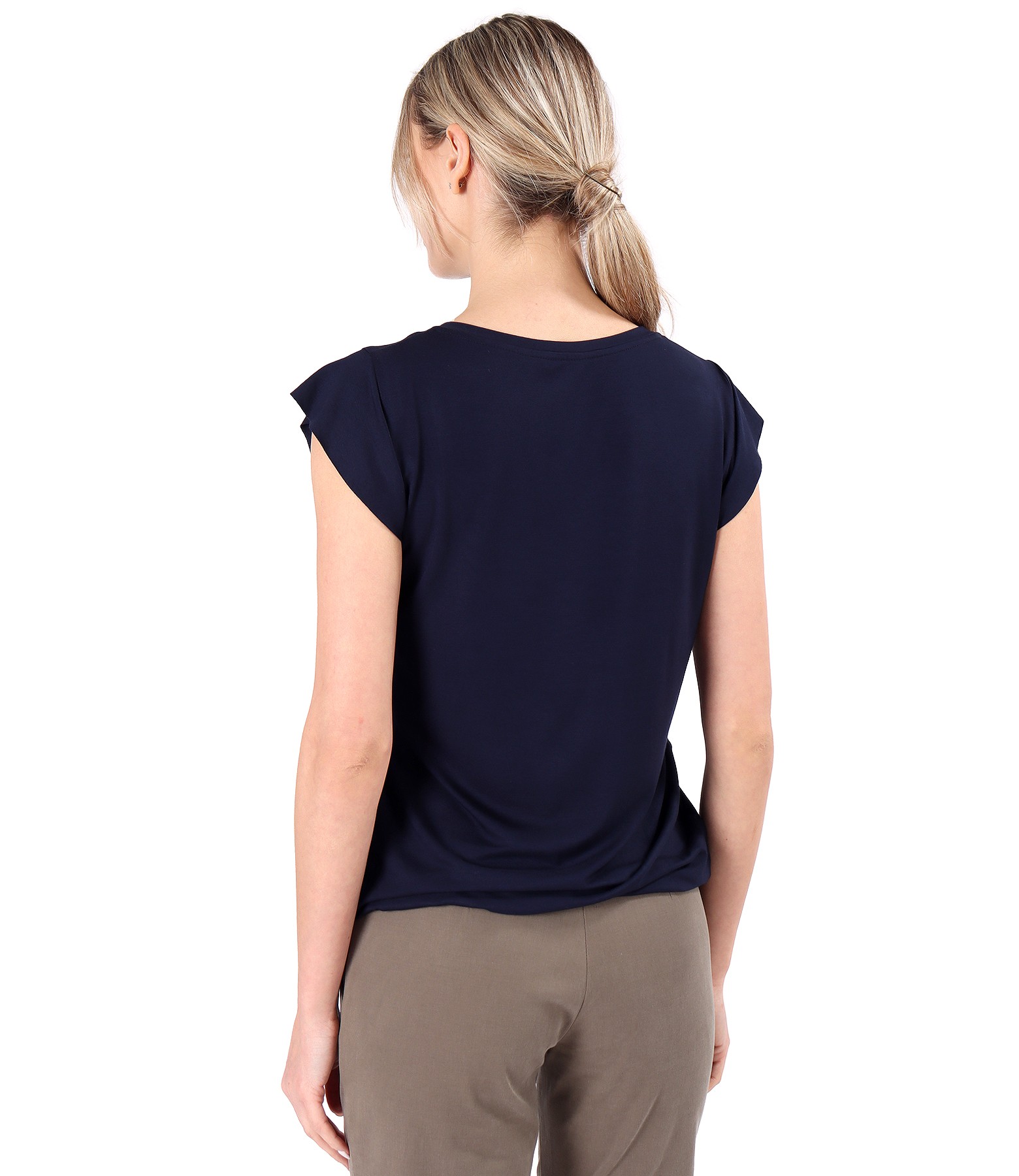 Bluza din jerse elastic uni cu flori aplicate la decolteu (Bleumarin), marimea