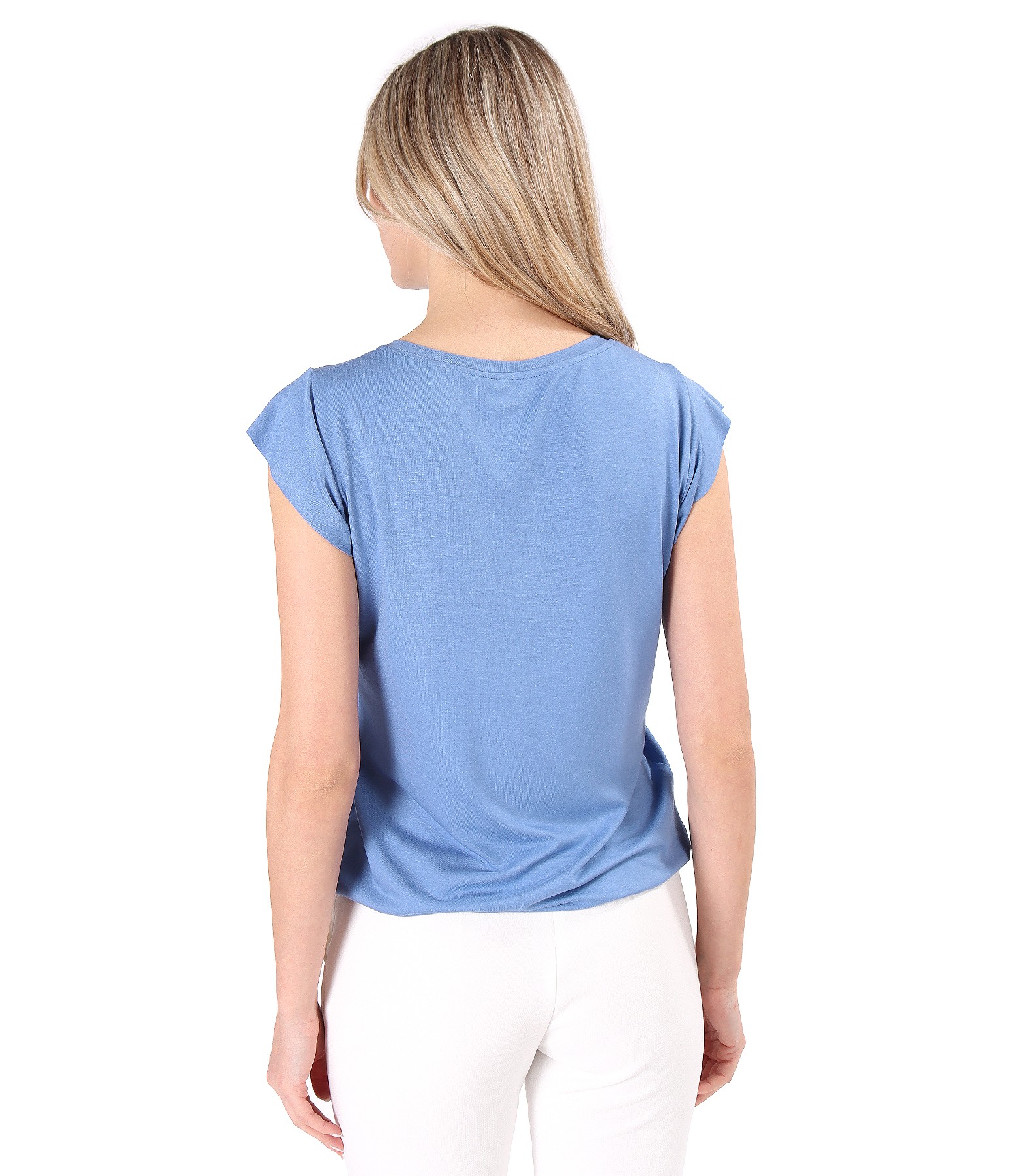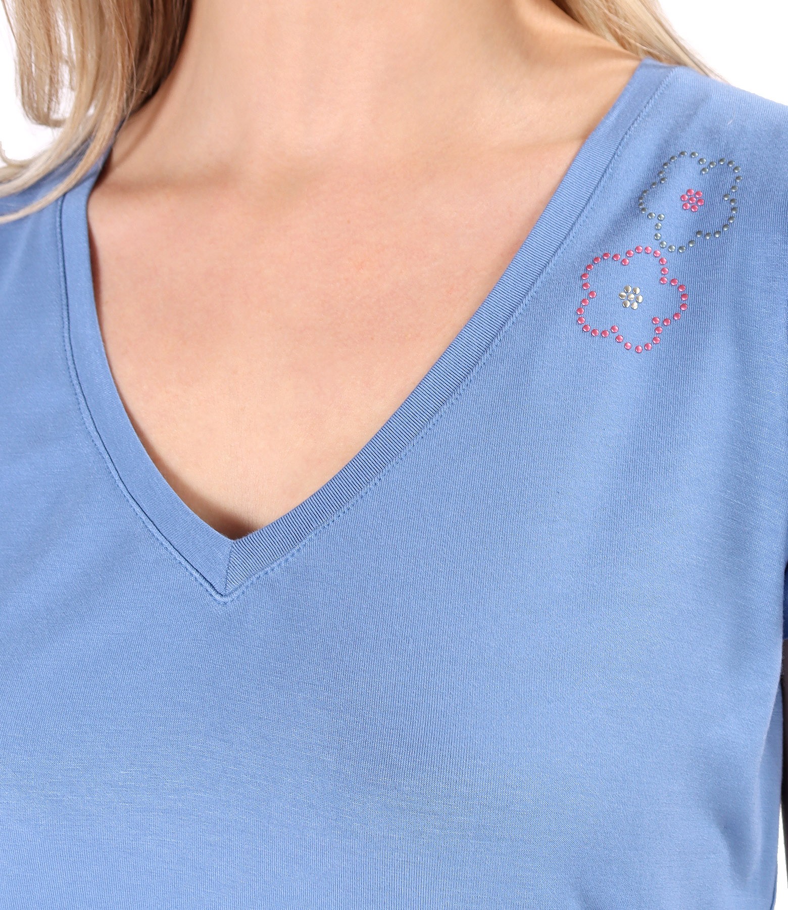 Bluza din jerse elastic uni cu flori aplicate la decolteu (Albastru deschis), marimea