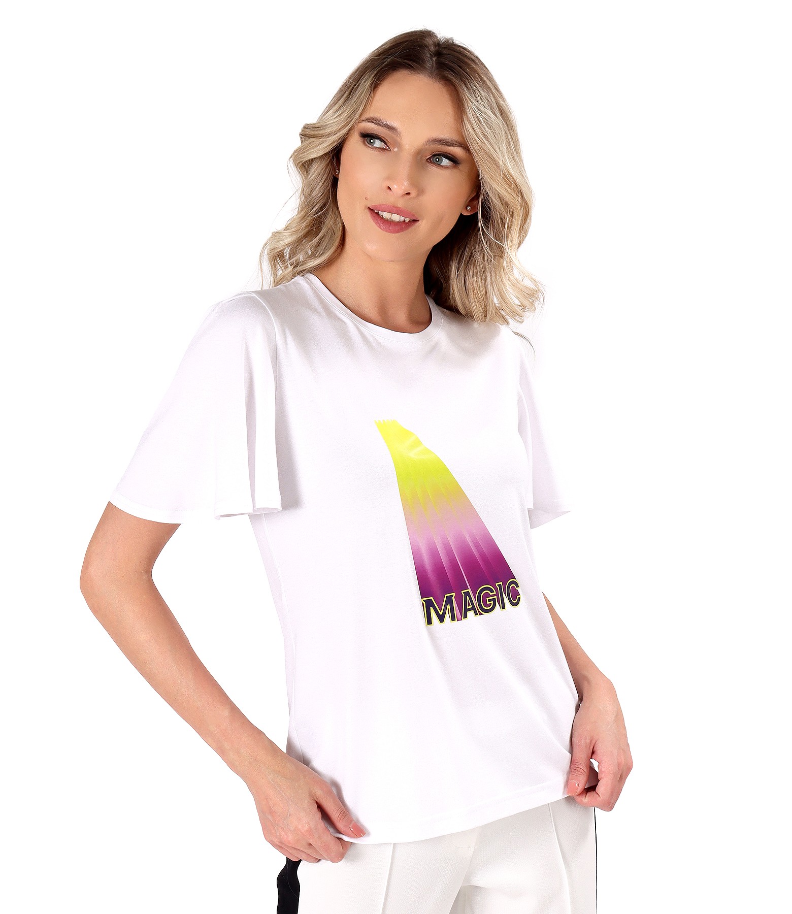 Bluza din jerse elastic uni cu maneci ample, imprimata pe fata prin serigrafie si cu decolteu rotund.