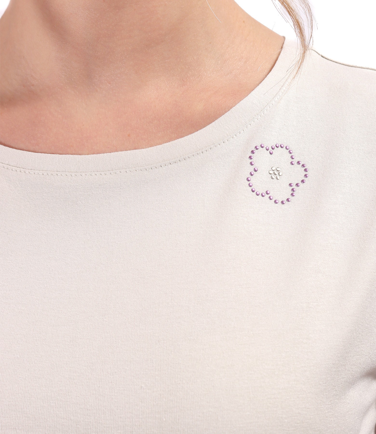 Bluza din jerse elastic uni cu umeri cazuti si decolteu rotund cu aplicatie decorativa in forma de floare.