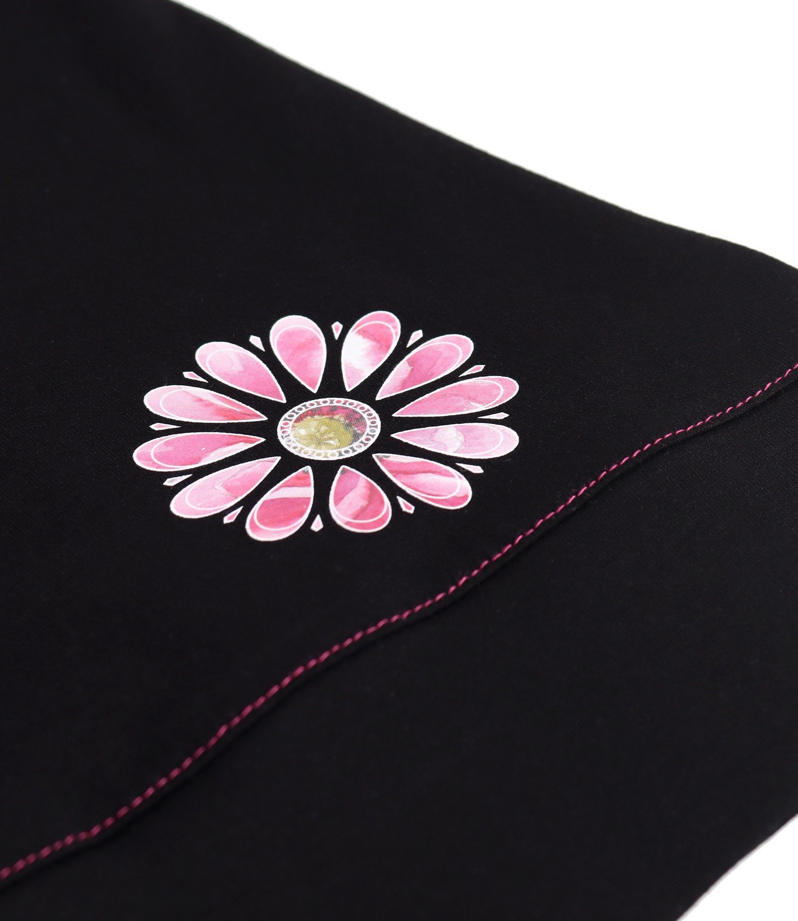 Bluza din jerse elastic uni cu umeri cazuti, cu decolteu rotund si cu aplicatie decorativa in forma de floare.