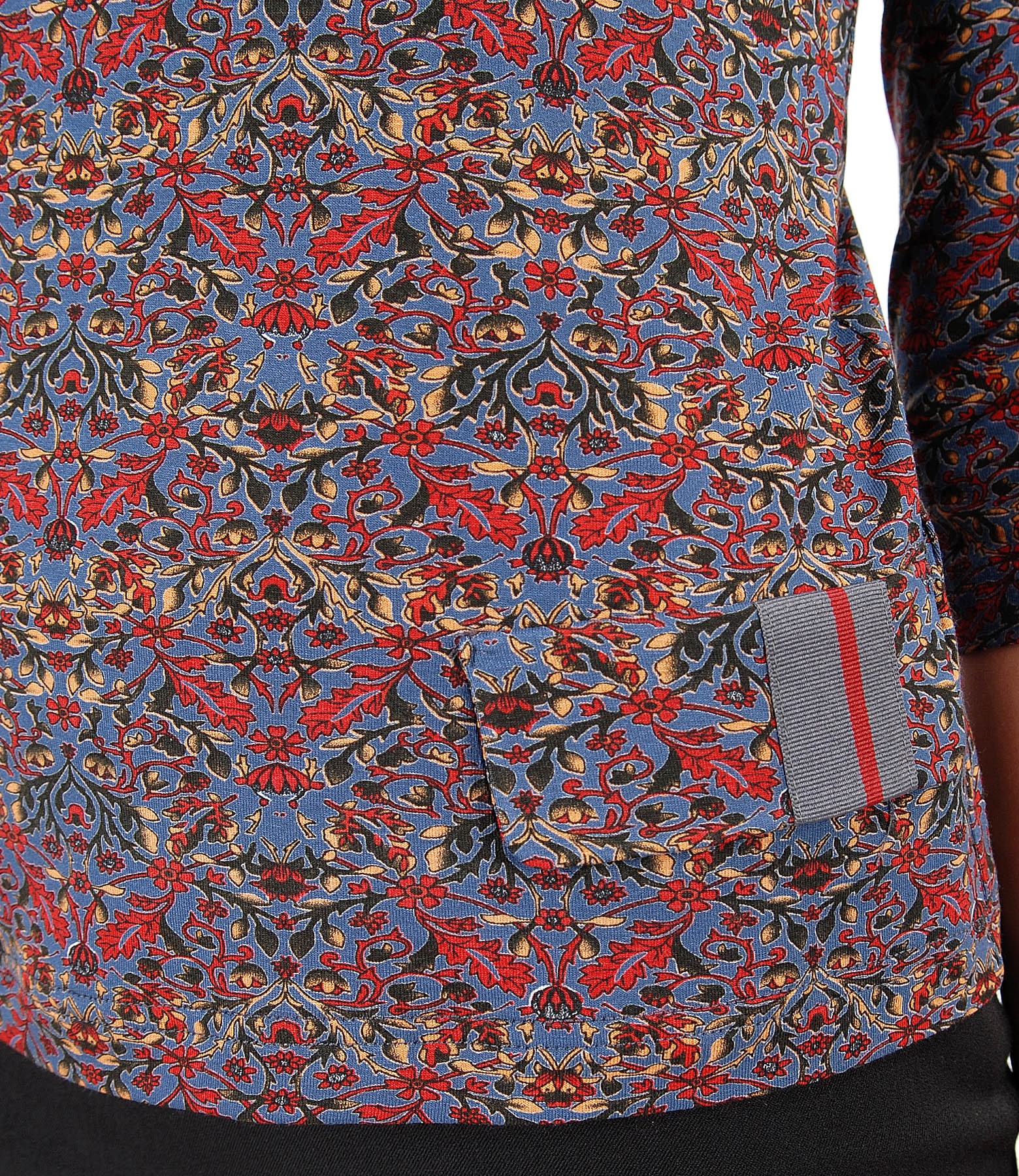 Bluza eleganta din jerse elastic, imprimat cu motive florale, cu maneci 3/4 si clape decorative.