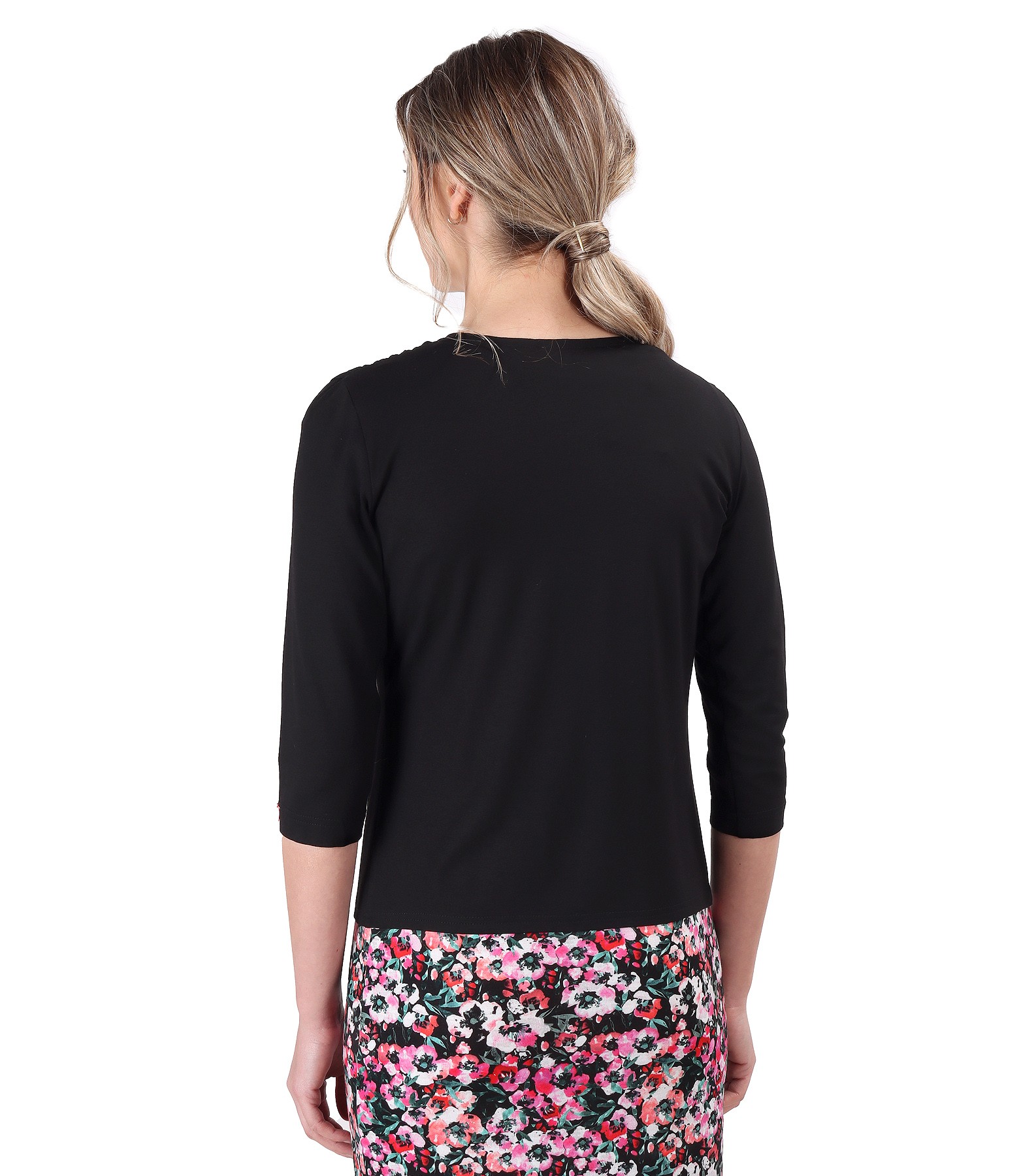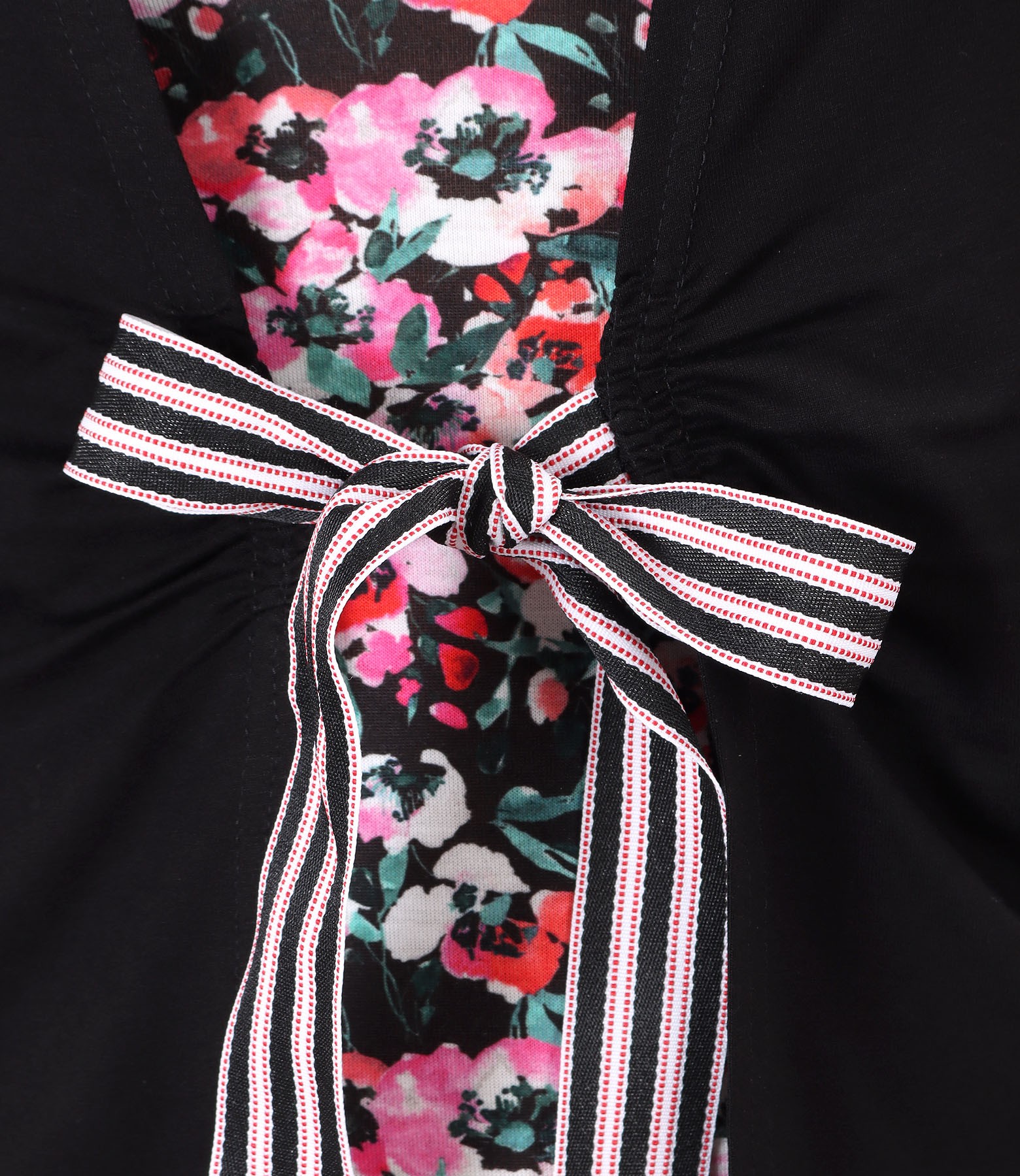 Bluza din jerse elastic uni, deschisa in fata si incretita in dreptul taliei. Cu maneca decorata cu inimioara metalica. Se leaga cu un cordon din rips in fata.