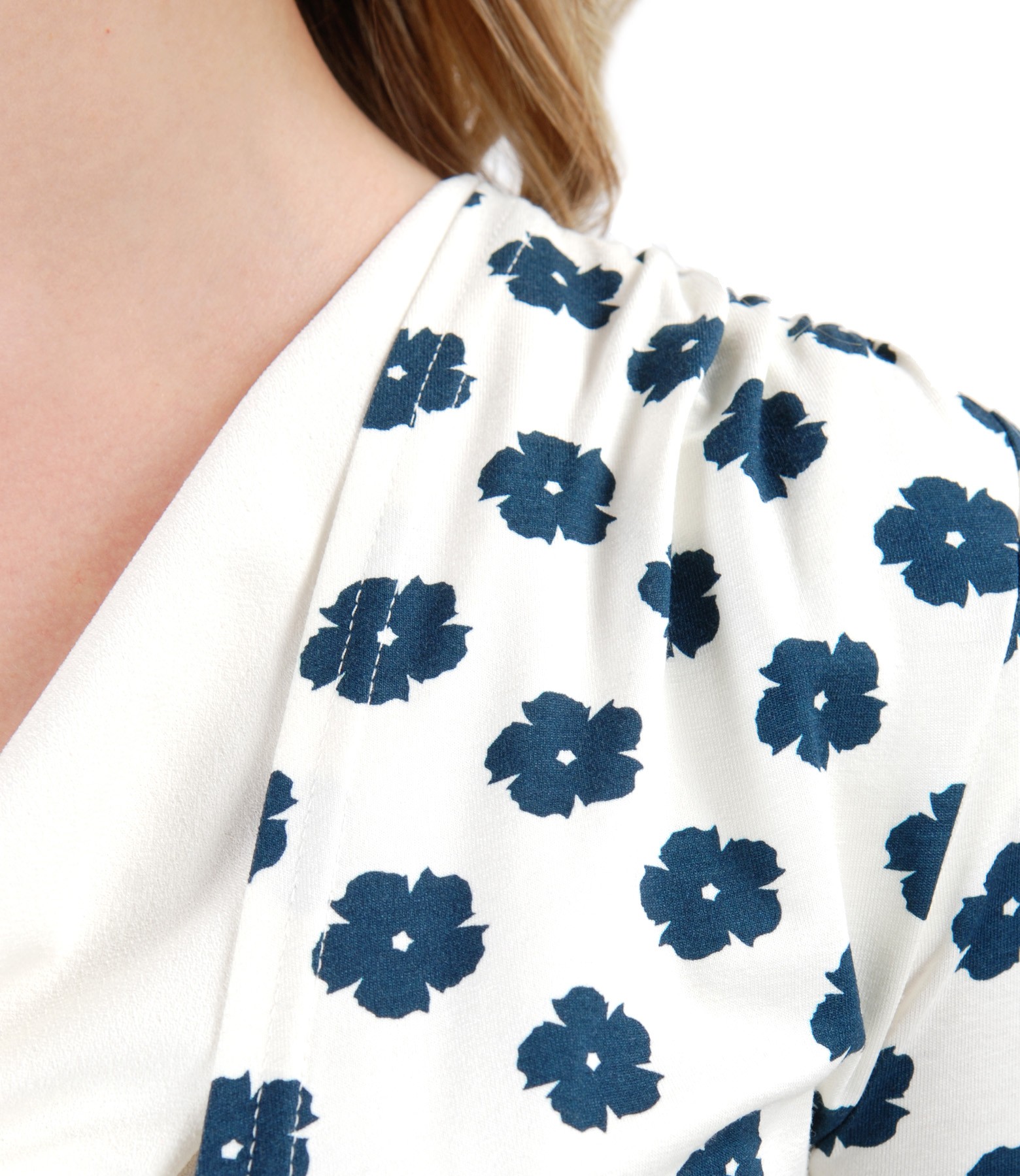 Bluza din jerse elastic, cu imprimeu floral, deschisa in fata si incretita in dreptul taliei. Se leaga cu un cordon in fata.