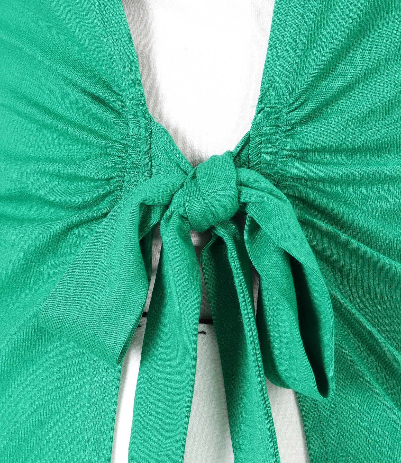 Bluza din jerse elastic, deschisa in fata si incretita in dreptul taliei. Se leaga cu un cordon in fata.