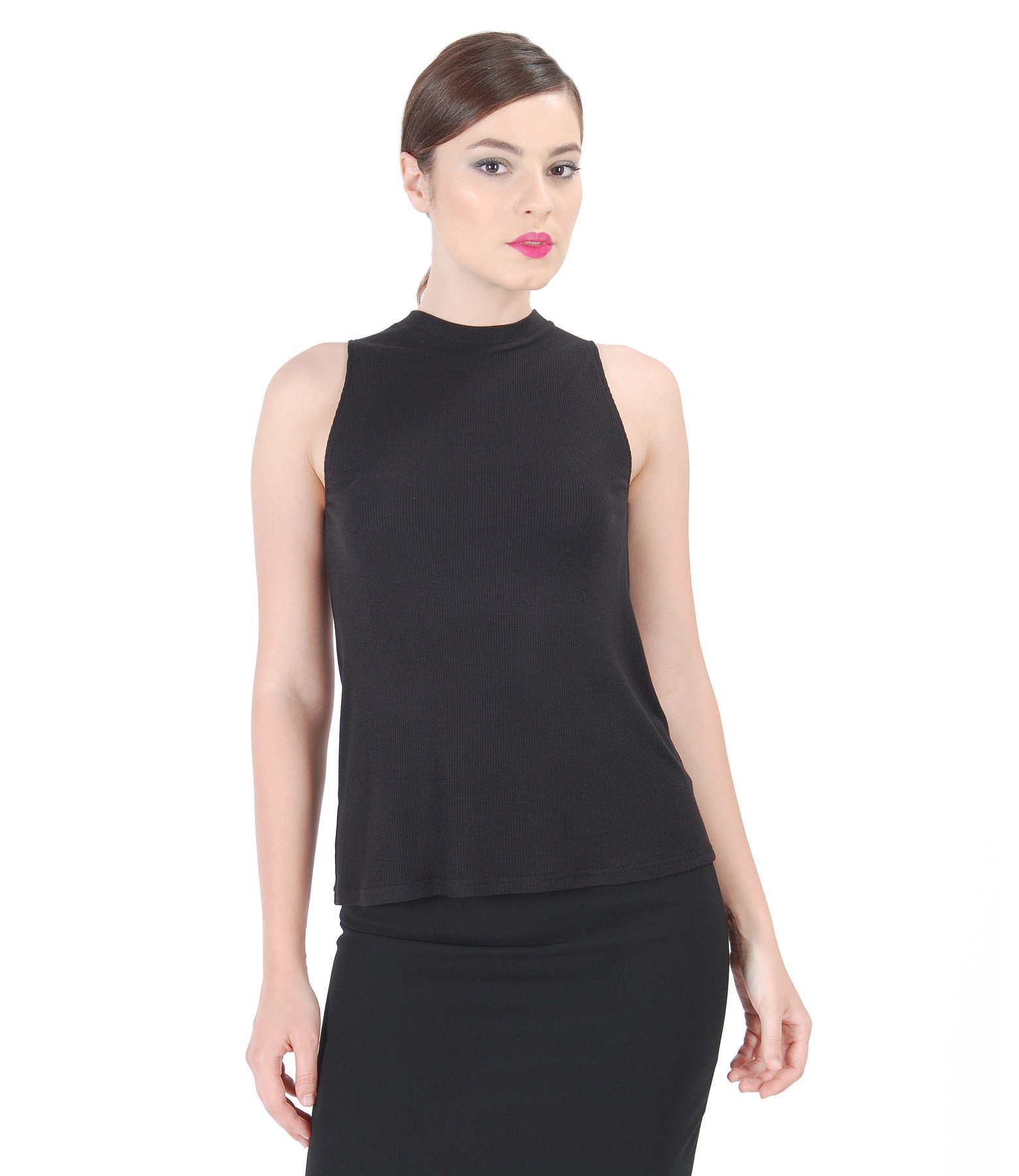 Bluza din jerse raiat de viscoza, fara maneci, cu guler la baza gatului. Se inchide cu un anou mos-baba pe spate.