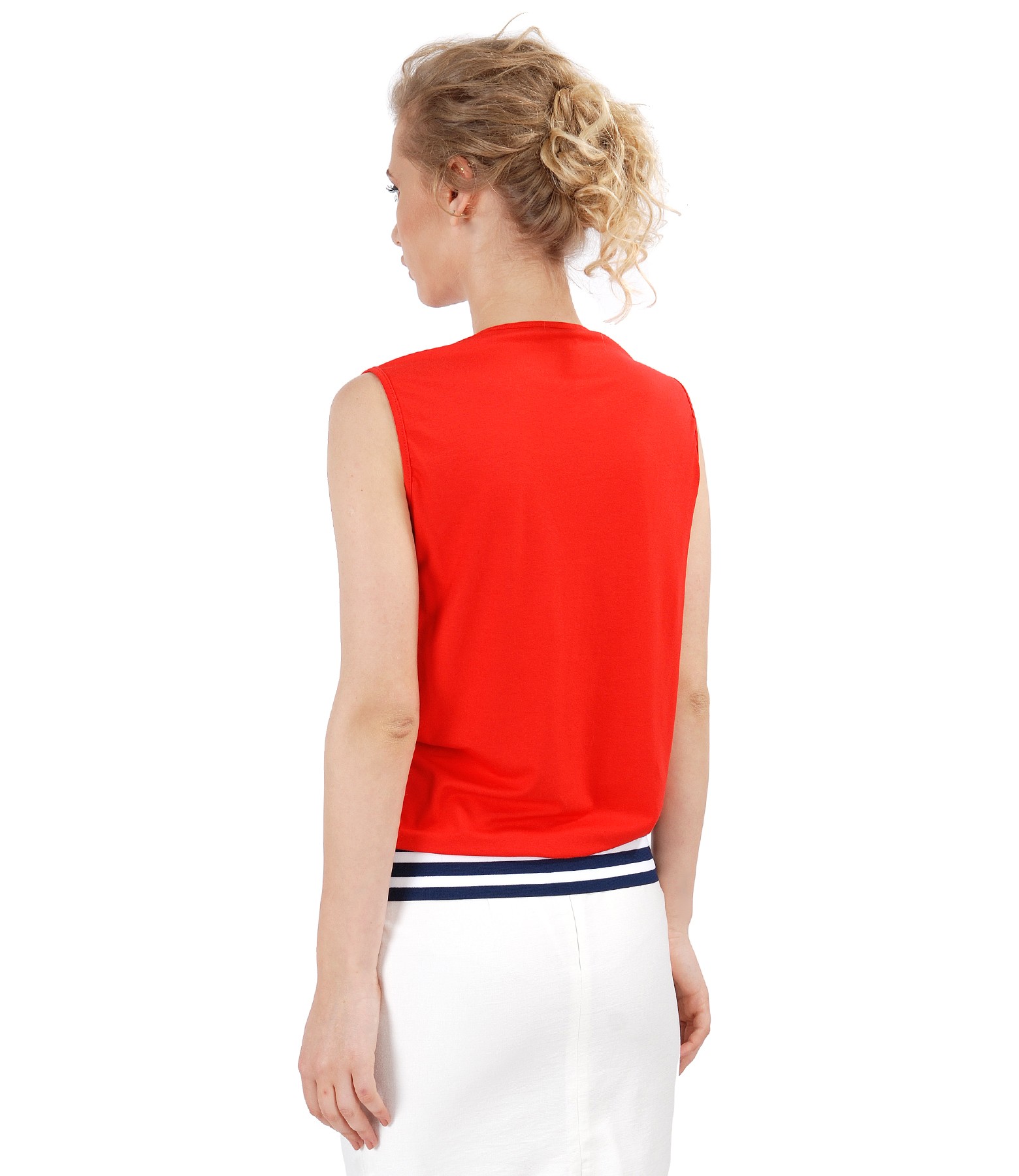 Tricou din jerse uni cu decolteu rotund, fara maneci, cu garnitura elastica aplicata la terminatie.