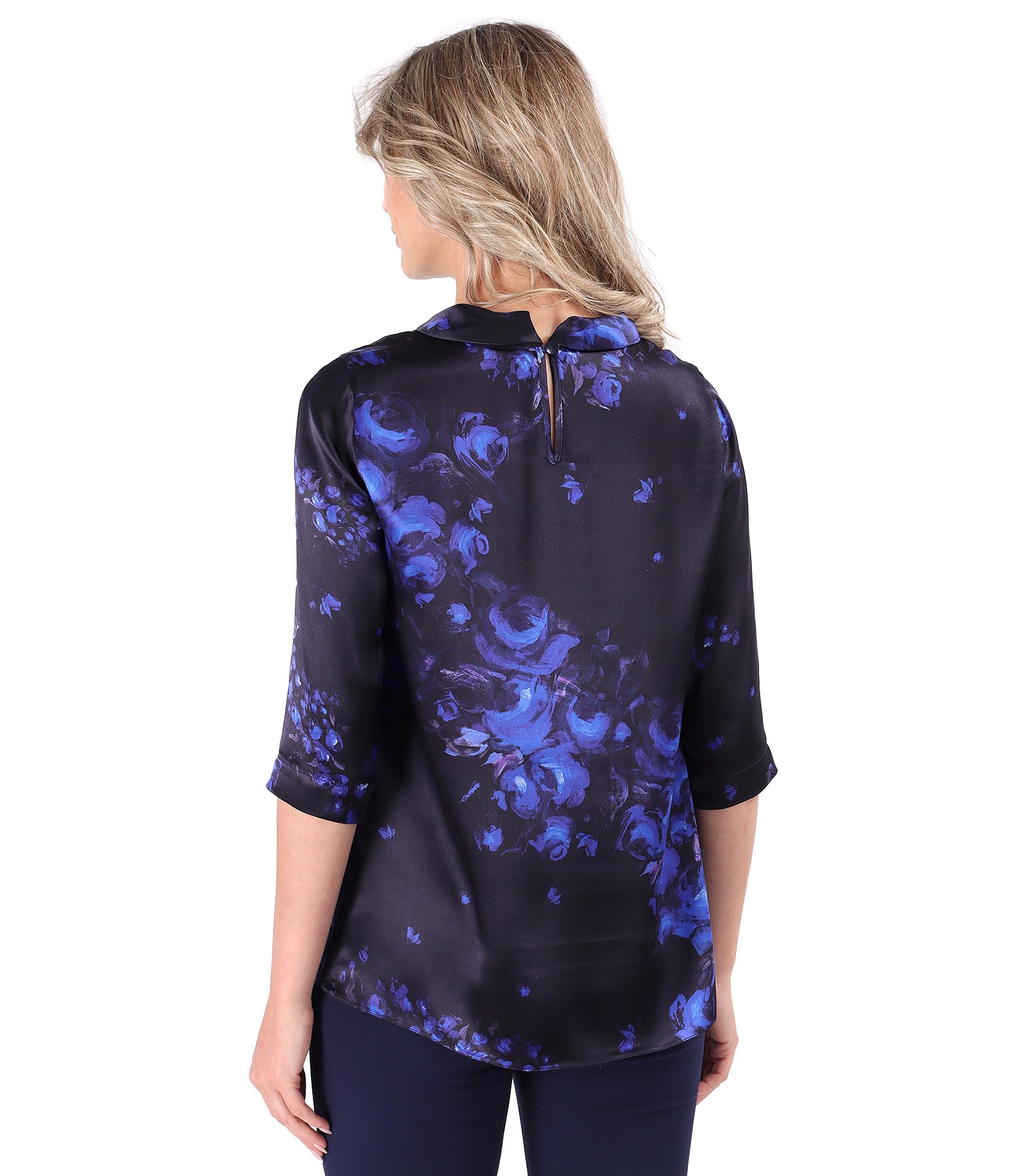 Bluza din matase naturala imprimata cu motive florale, maneci 3/4, cu fald pe mijloc fata si decolteu rotund. Se inchide cu un nasture pe mijloc spate. Pozitia imprimeului variaza per produs.