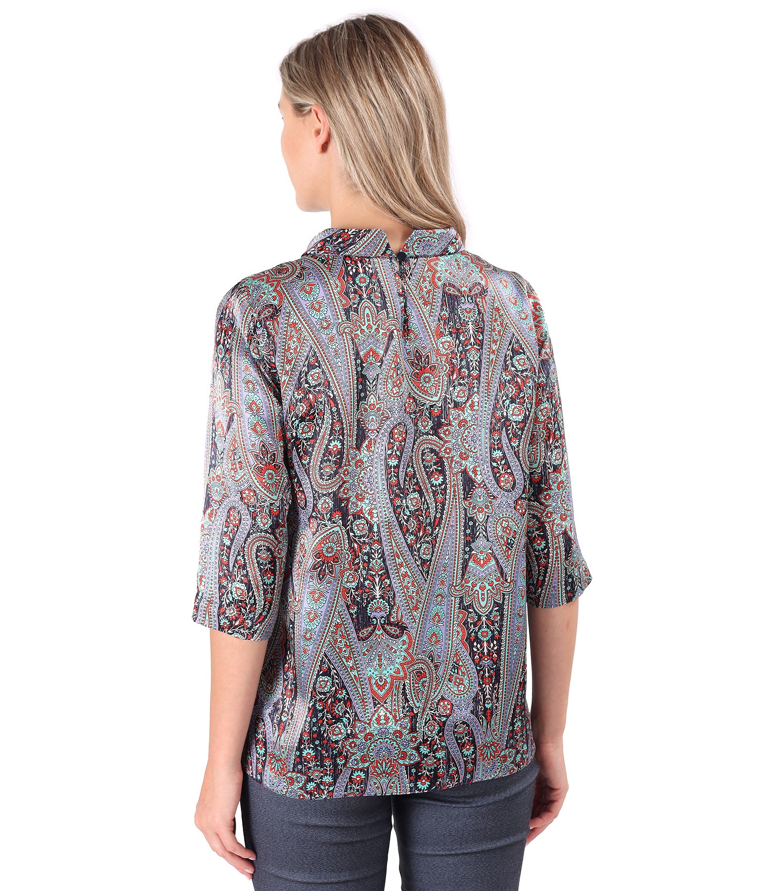 Bluza din matase naturala imprimata digital cu motive paisley 3/4, cu fald pe mijloc fata si decolteu rotund. Se inchide cu un nasture pe mijloc spate. Pozitia imprimeului variaza per produs.