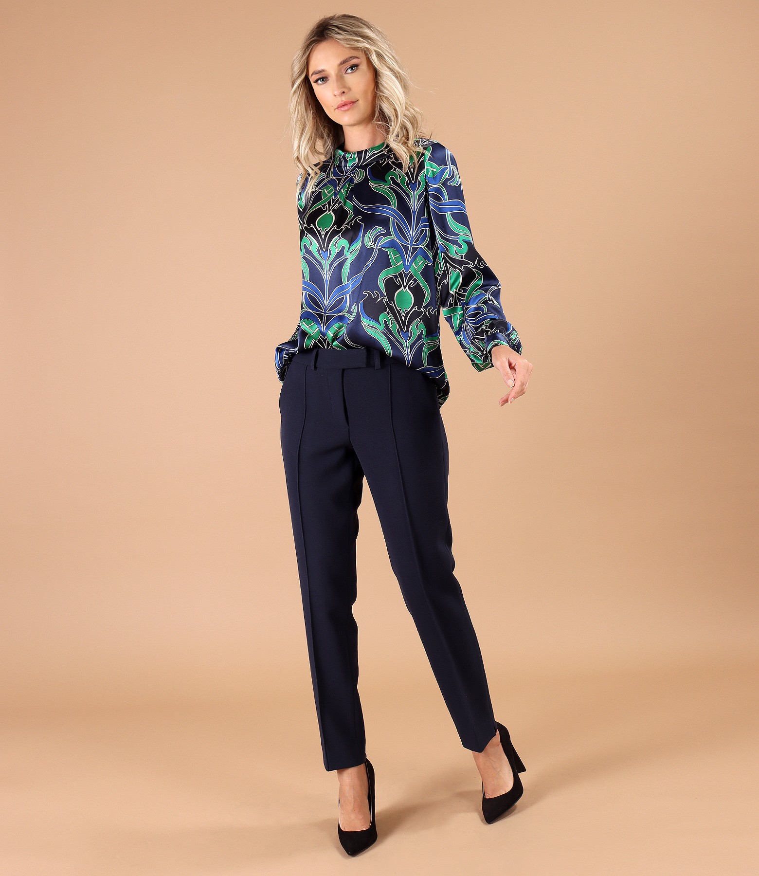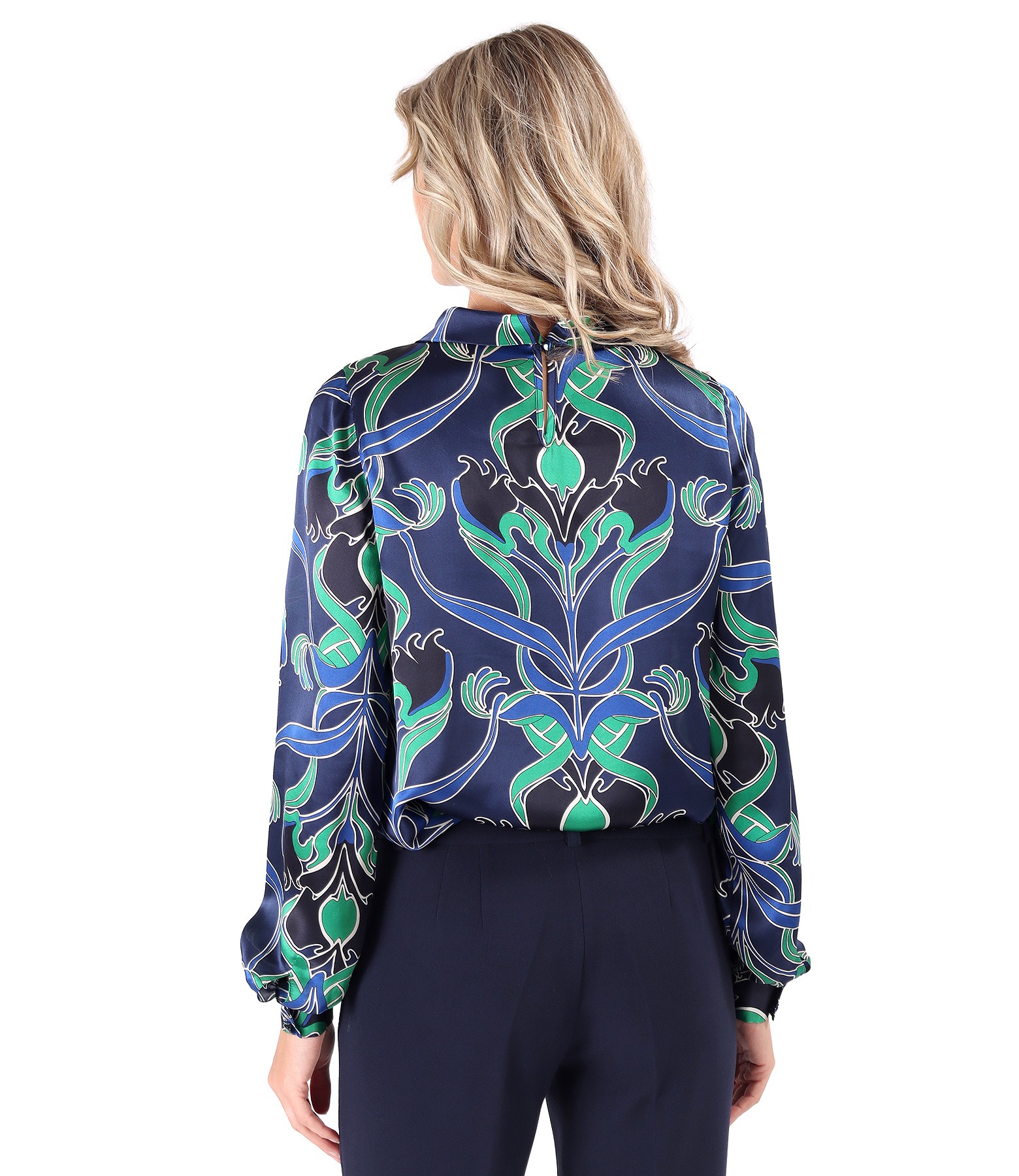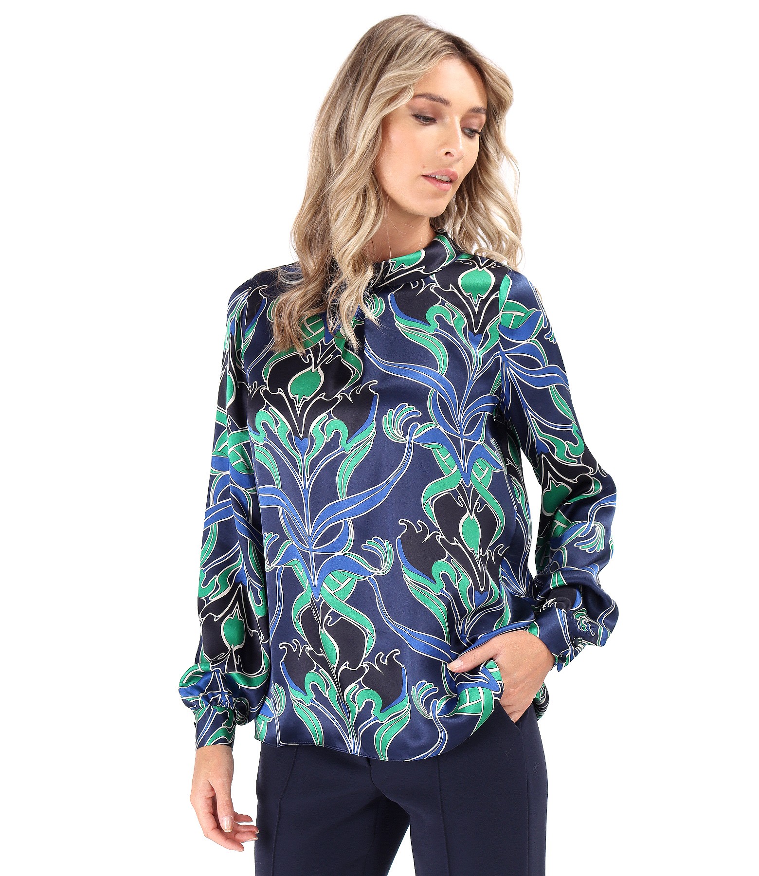Bluza din matase naturala imprimata cu motive florale, maneci lungi incretite cu mansete din acelasi material cu 2 nasturi, cu fald pe mijloc fata si decolteu rotund. Se inchide cu un nasture pe mijloc spate. Pozitia imprimeului variaza per produs.
