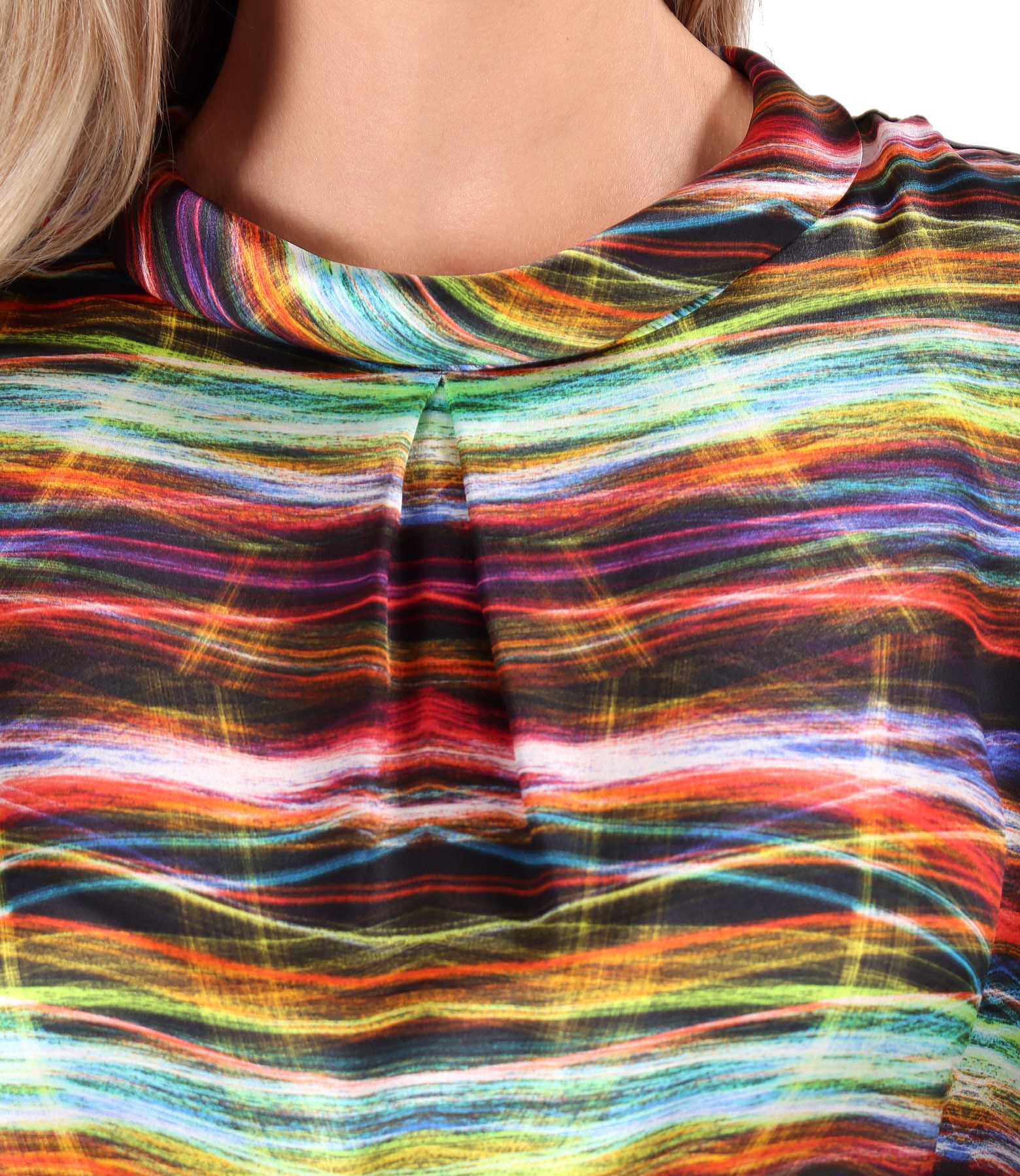 Bluza din matase naturala imprimata cu motive geometrice, maneci 3/4, cu fald pe mijloc fata si decolteu rotund. Se inchide cu un nasture pe mijloc spate.