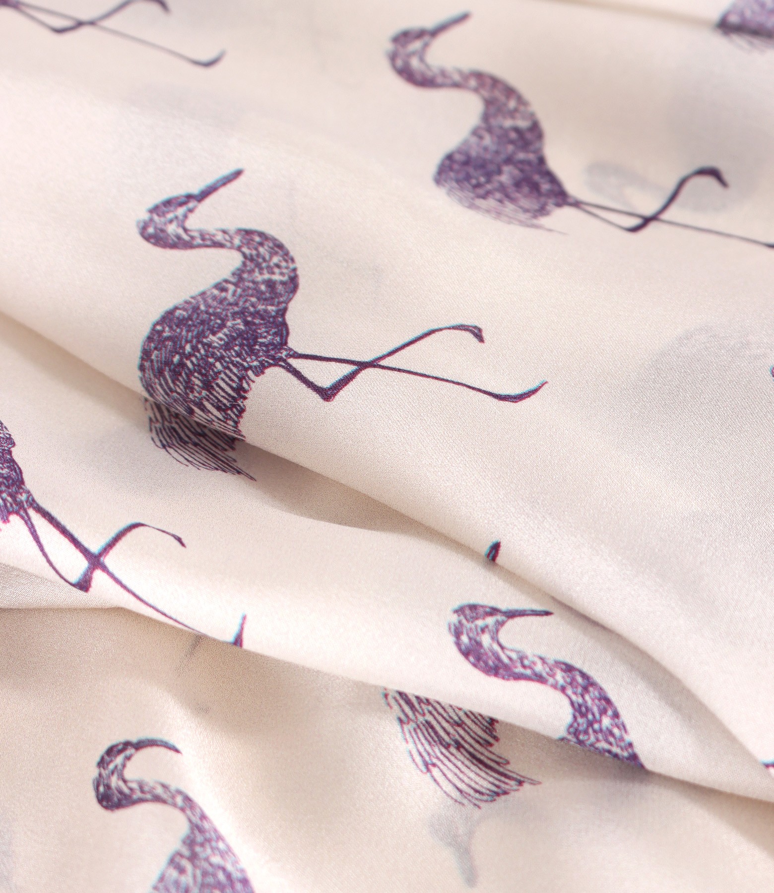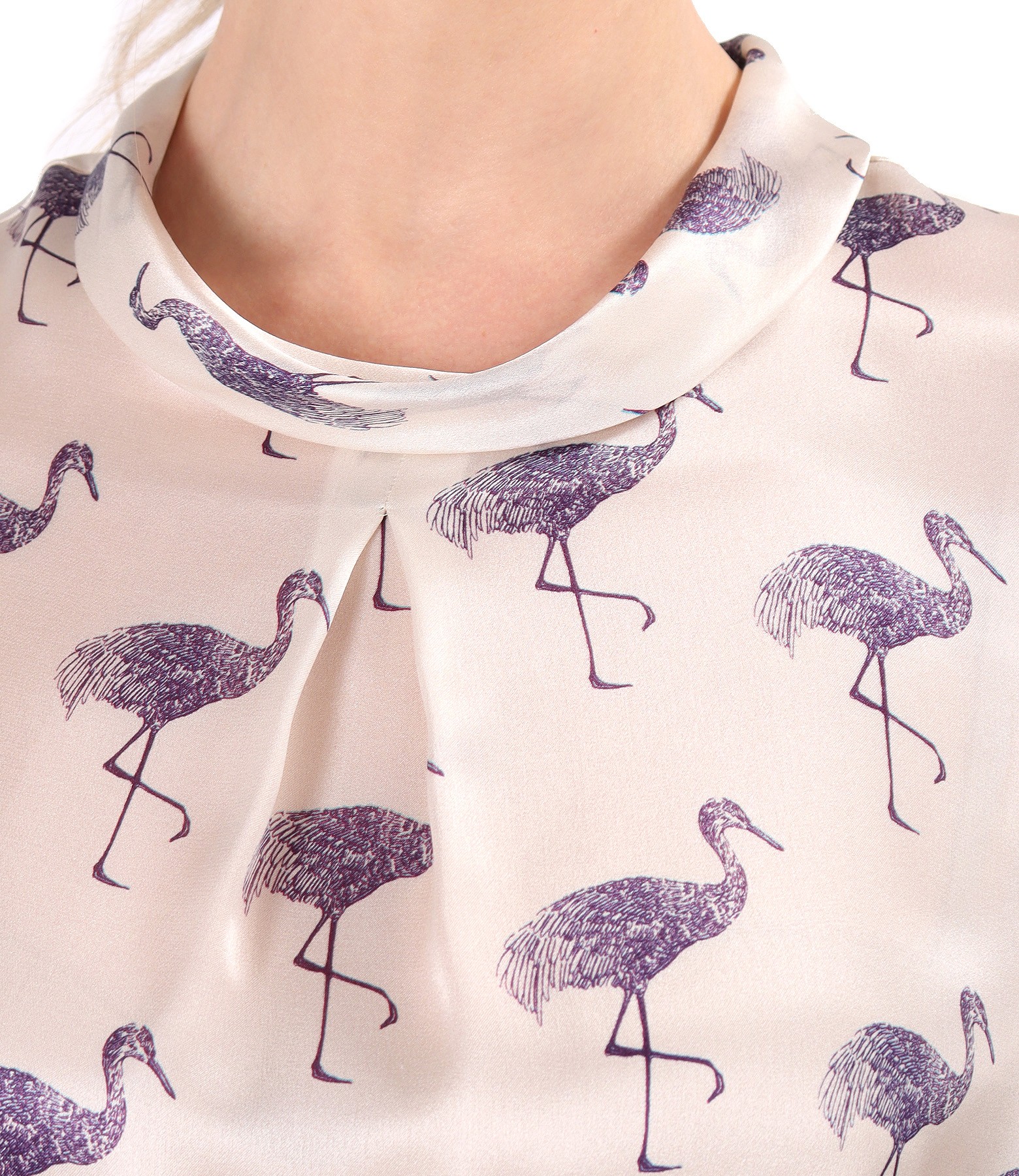 Bluza din matase naturala imprimata cu flamingo si usor transparenta, maneci scurte, cu fald pe mijloc fata si decolteu rotund. Se inchide cu un nasture pe mijloc spate. Pozitia imprimeului variaza per produs.
