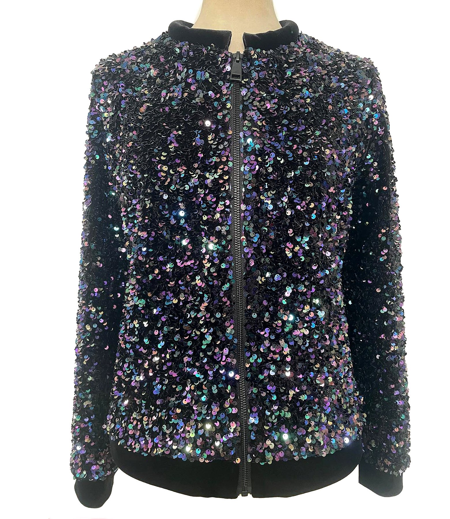 Bluza din paiete multicolore, cu guler rotund din catifea, pe langa gat si maneci lungi cu mansete din catifea. Se inchide cu fermoar pe miloc fata.