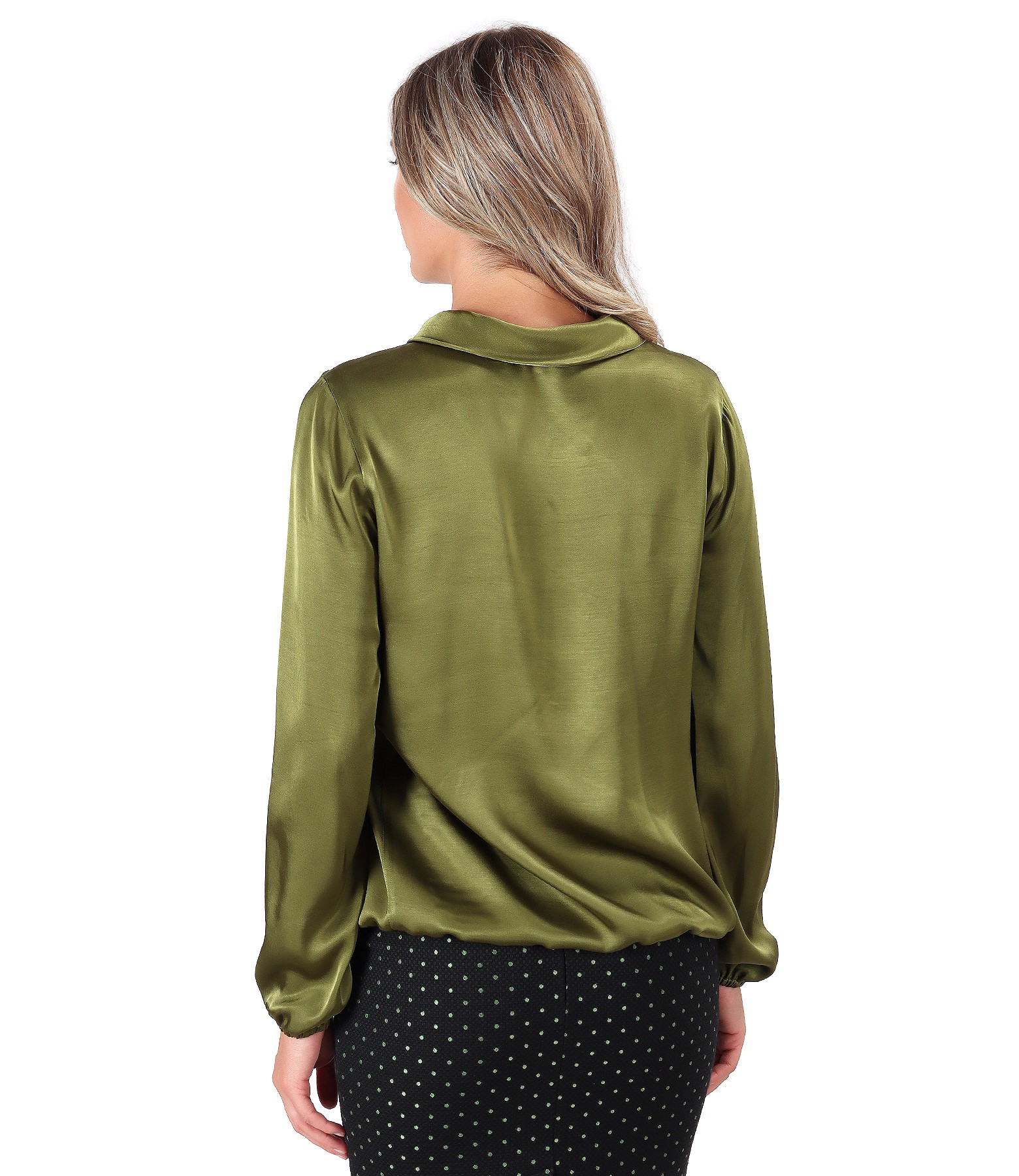 Bluza din saten de viscoza cu guler gen esarfa, maneci lungi si elastic la terminatii.