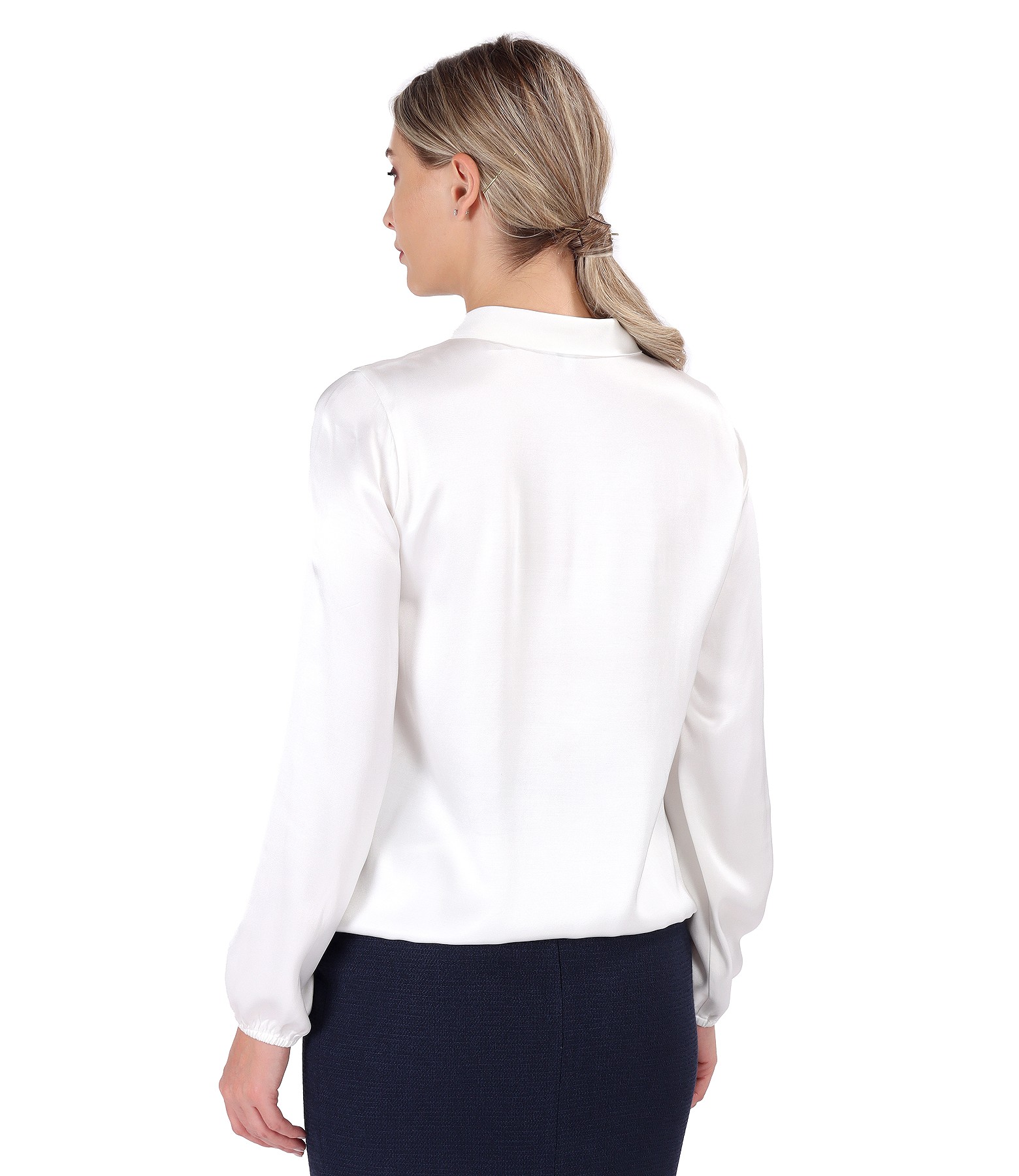 Bluza din saten de viscoza cu guler gen esarfa, maneci lungi cu elastic la terminatii.