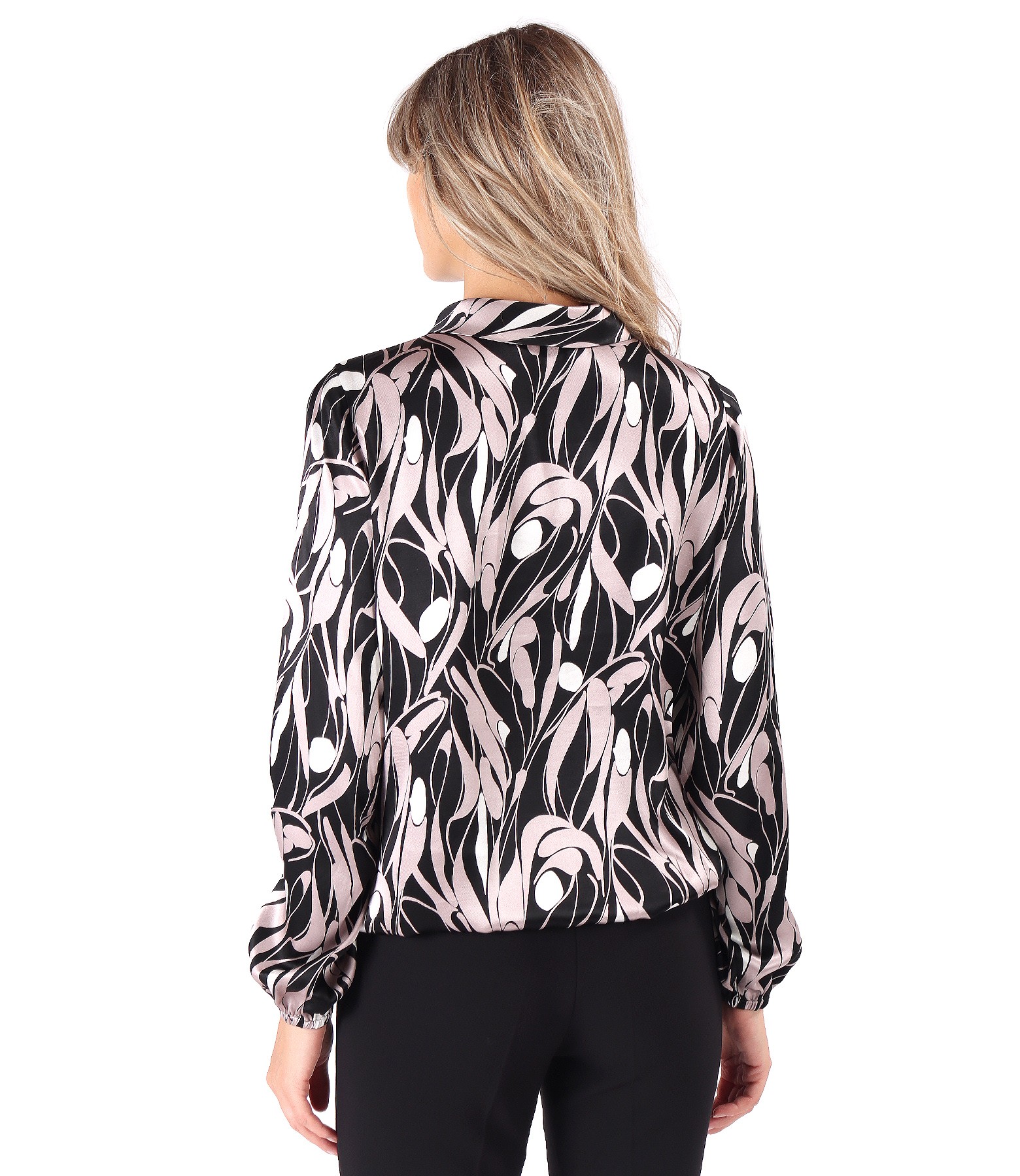 Bluza din saten de viscoza imprimata digital cu motive florale, cu guler gen esarfa, maneci lungi si elastic la terminatii.