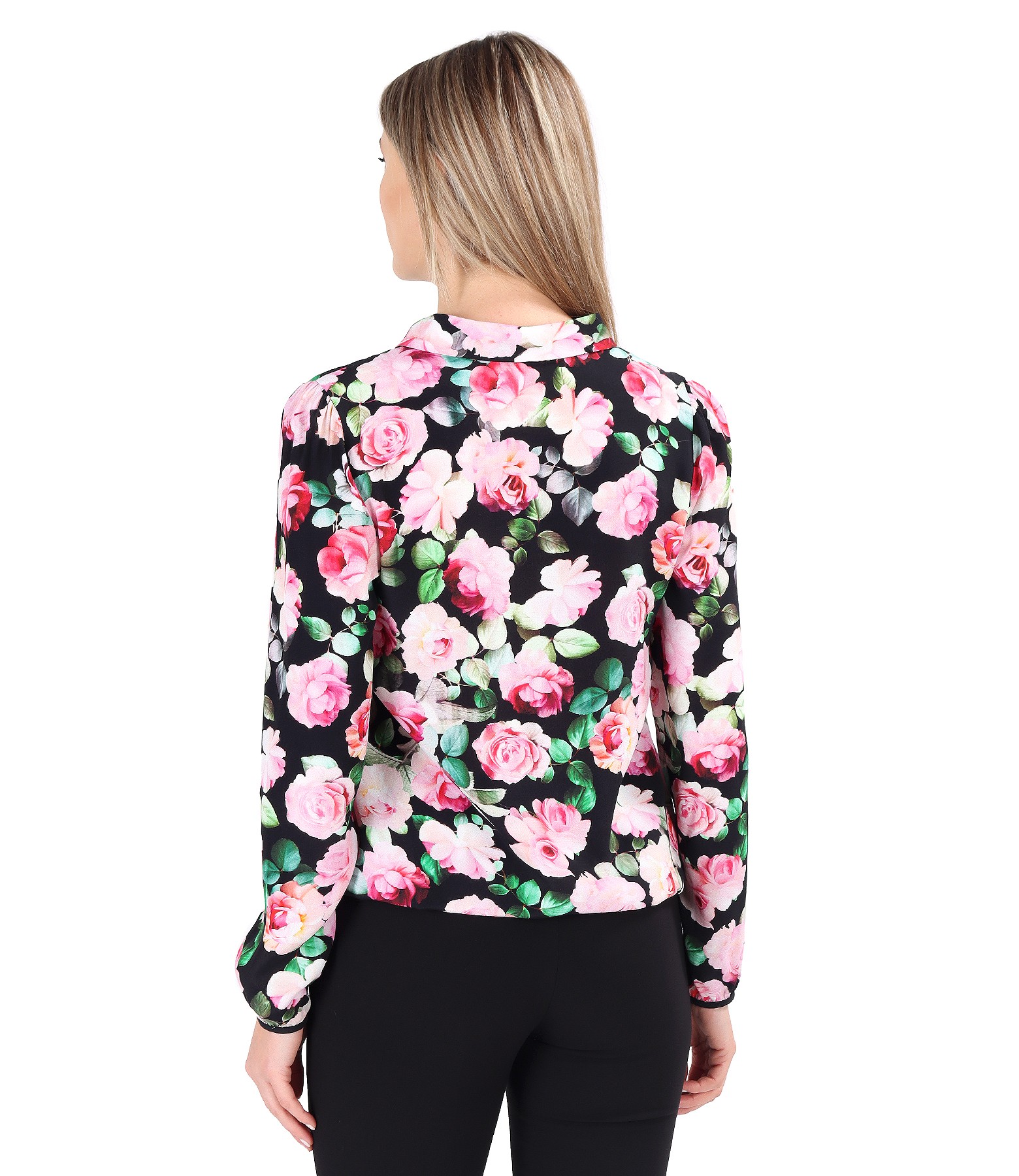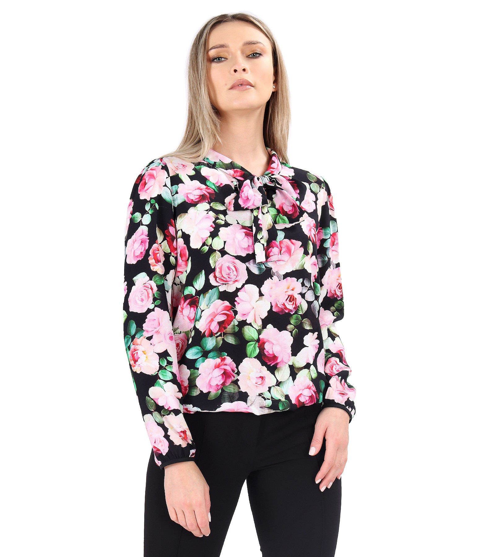 Bluza din saten de viscoza imprimata cu motive florale cu guler gen esarfa, maneci lungi cu elastic la terminatii.
