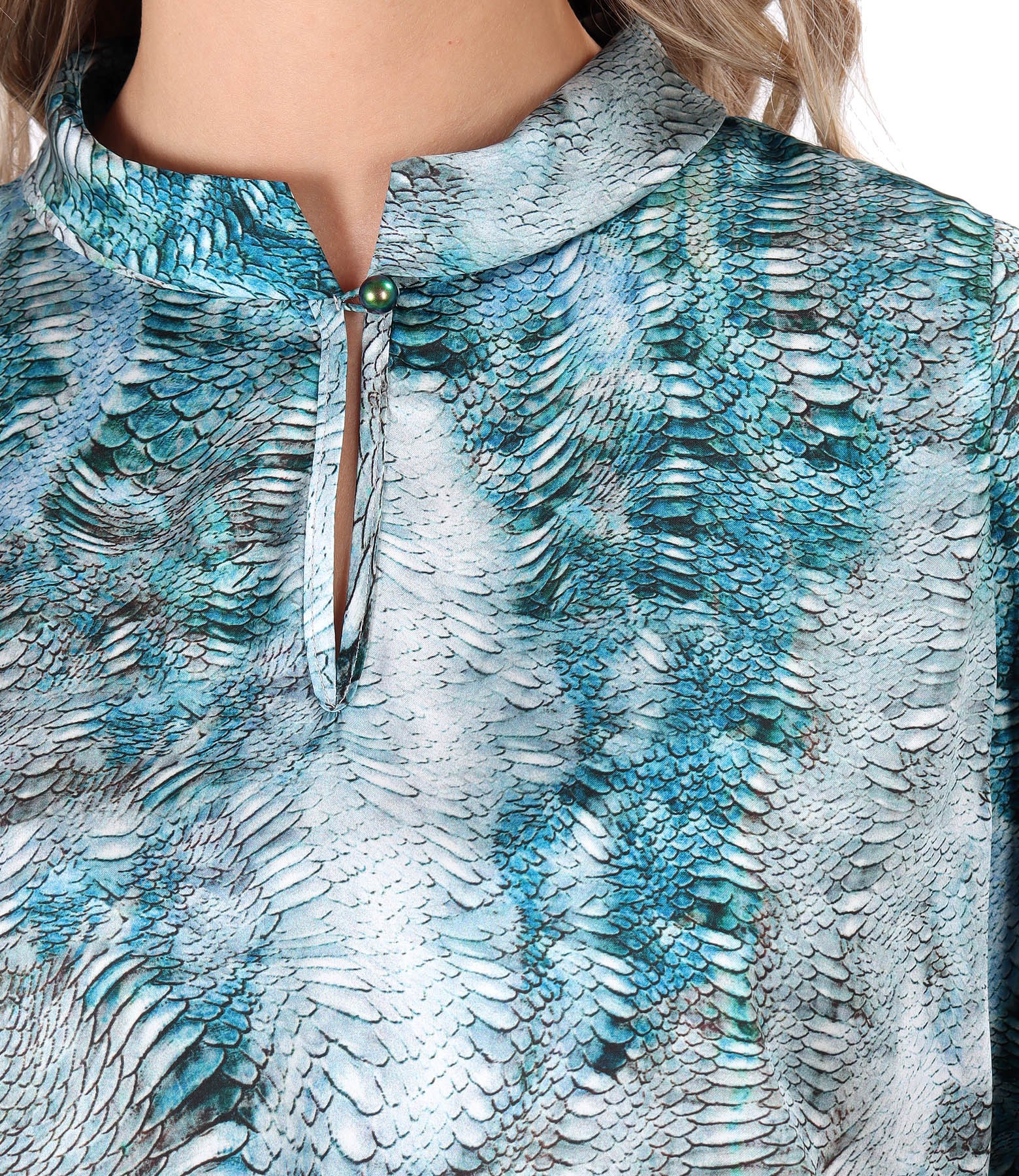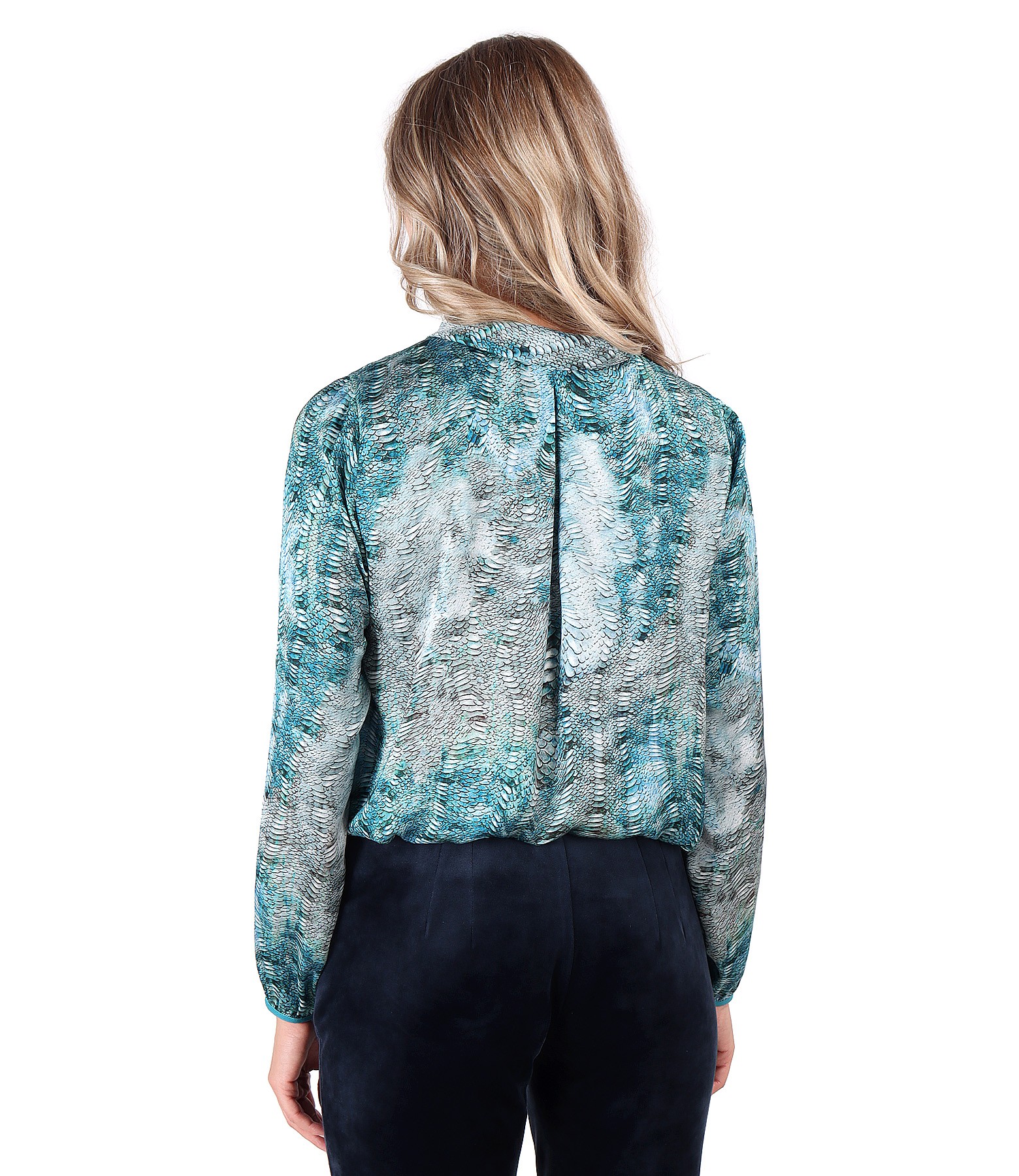Bluza eleganta, din saten imprimat, maneci lungi cu elastic la terminatie, cu fald pe mijloc spate si cu decolteu rotund cu V inchis pe fata cu o perla.