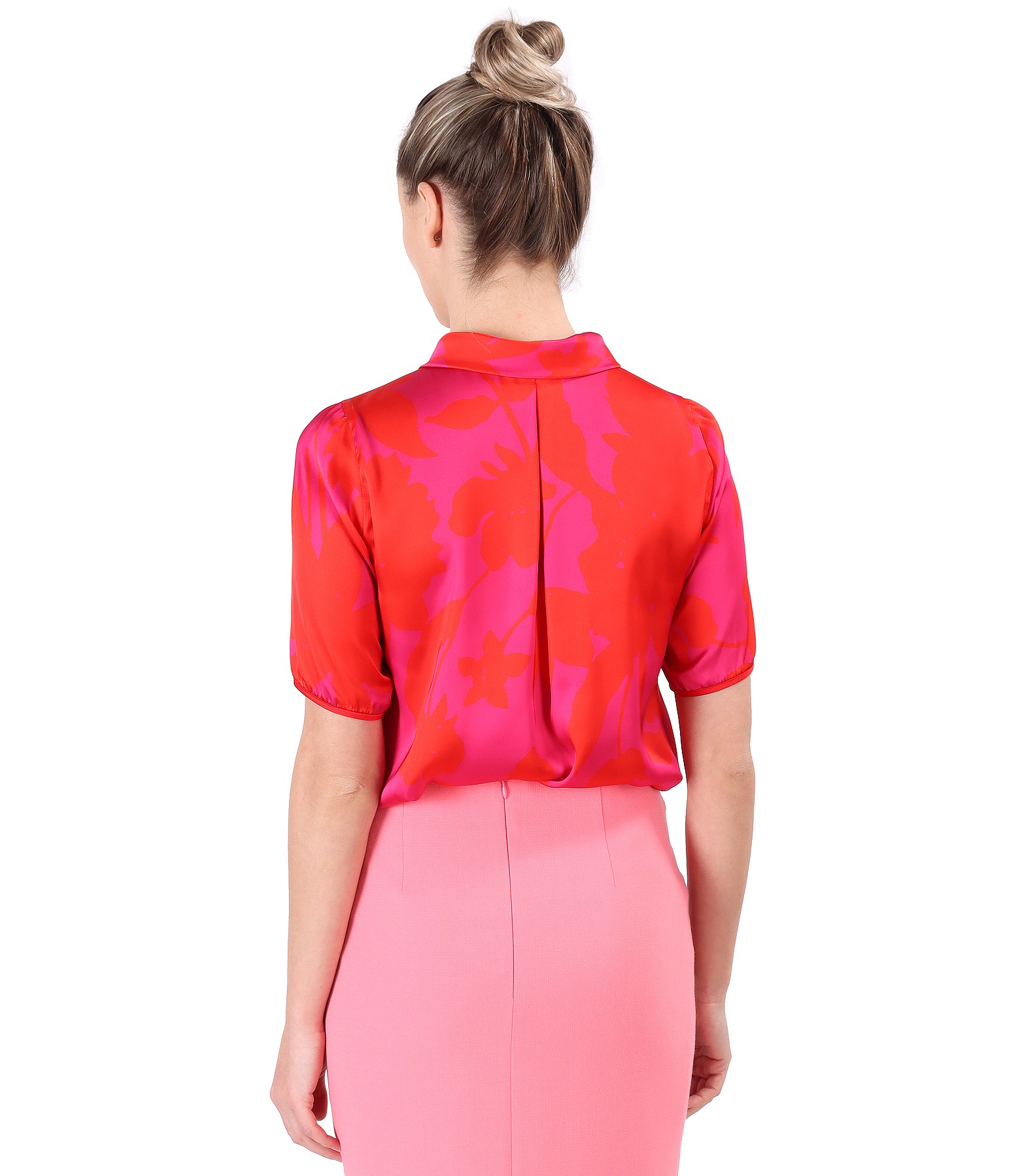 Bluza eleganta, usor satinata, imprimata cu motive florale, maneci scurte cu elastic la terminatie, cu fald pe mijloc spate si decolteu rotund cu V inchis pe fata cu un nasture.