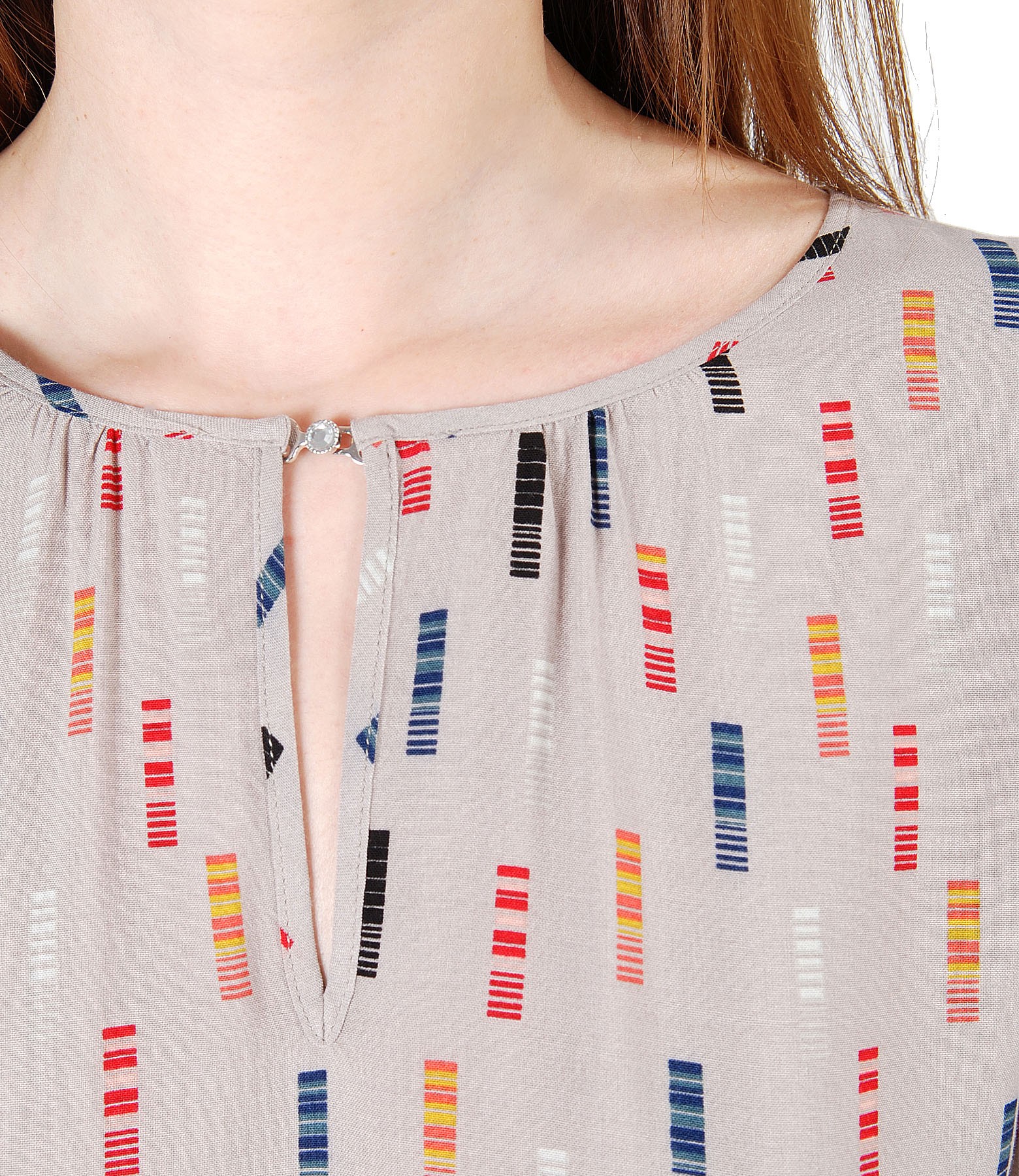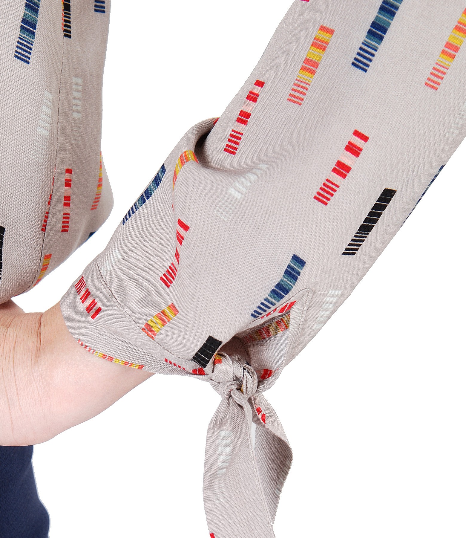 Bluza din viscoza imprimata cu motive geometrice, cu maneci lungi cu mansete care se leaga si decolteu rotund cu V inchis cu un nasture.