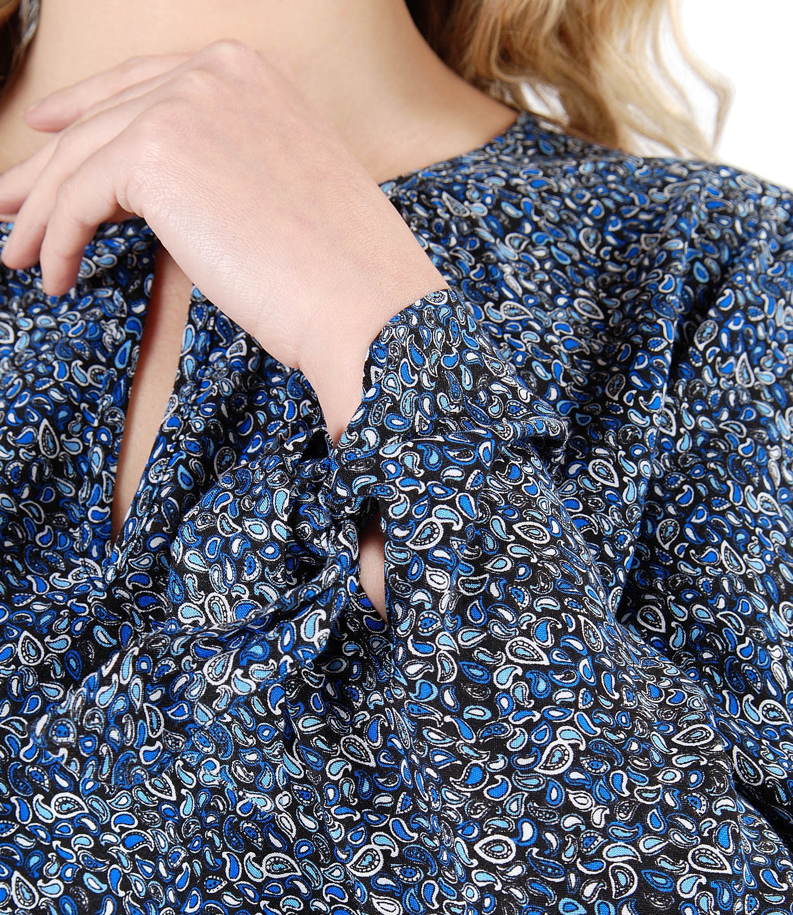Bluza din viscoza imprimata cu motive florale, cu maneci lungi cu mansete care se leaga si decolteu rotund cu V inchis cu un nasture.