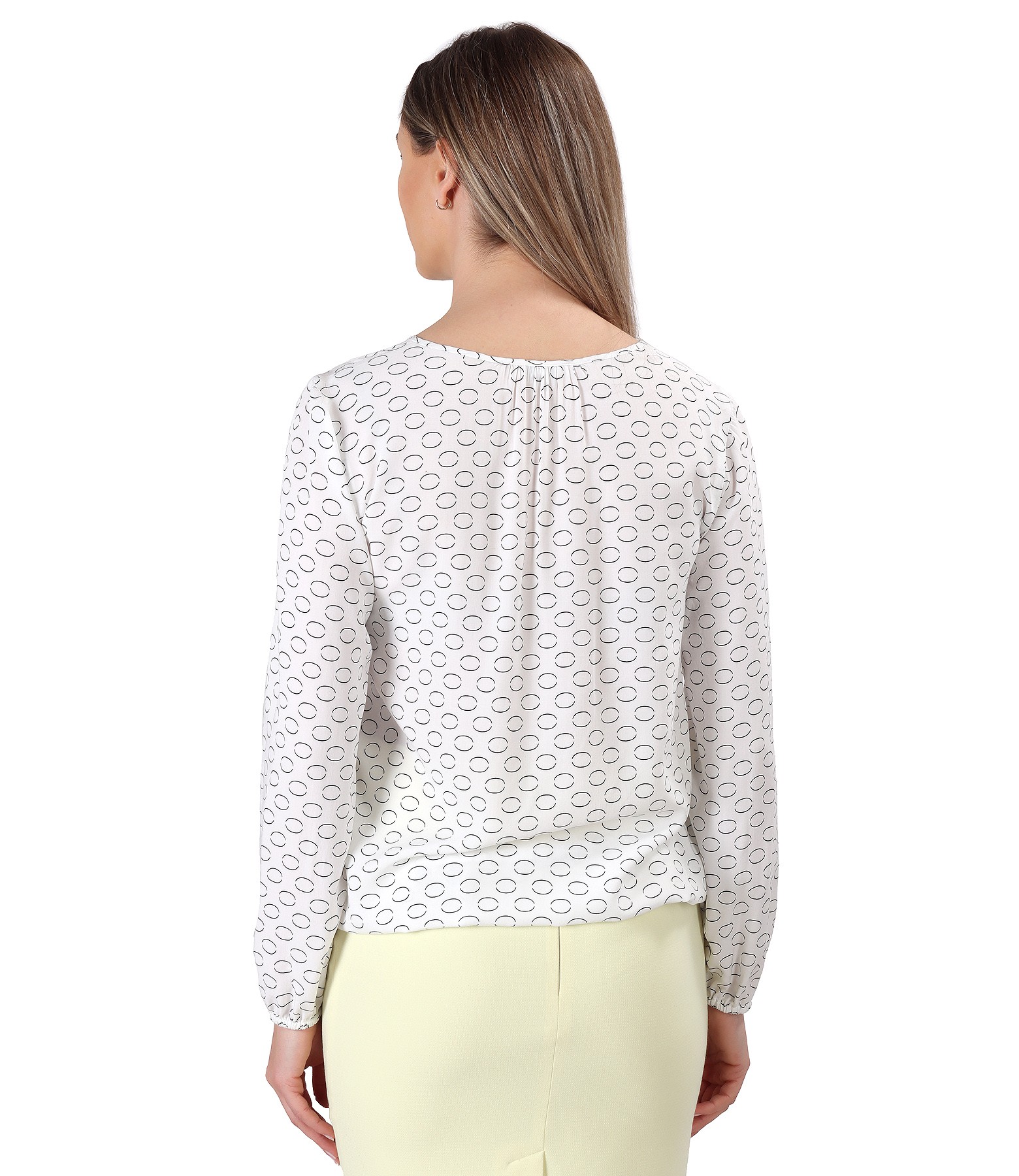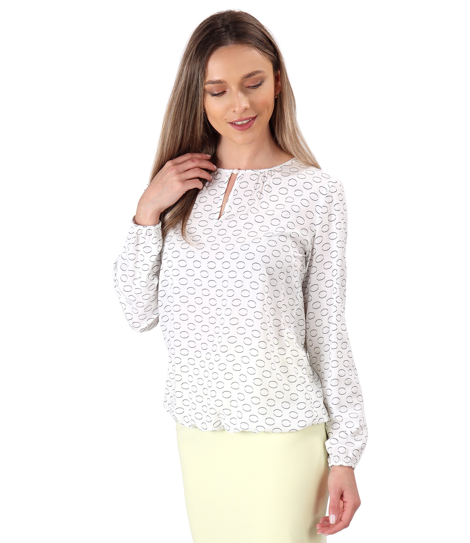 Bluza eleganta din viscoza imprimata cu cercuri, cu maneci lungi cu elastic, cu decolteu rotund si terminatie elastica in talie. Se inchide cu un nasture tip perla pe mijloc fata.