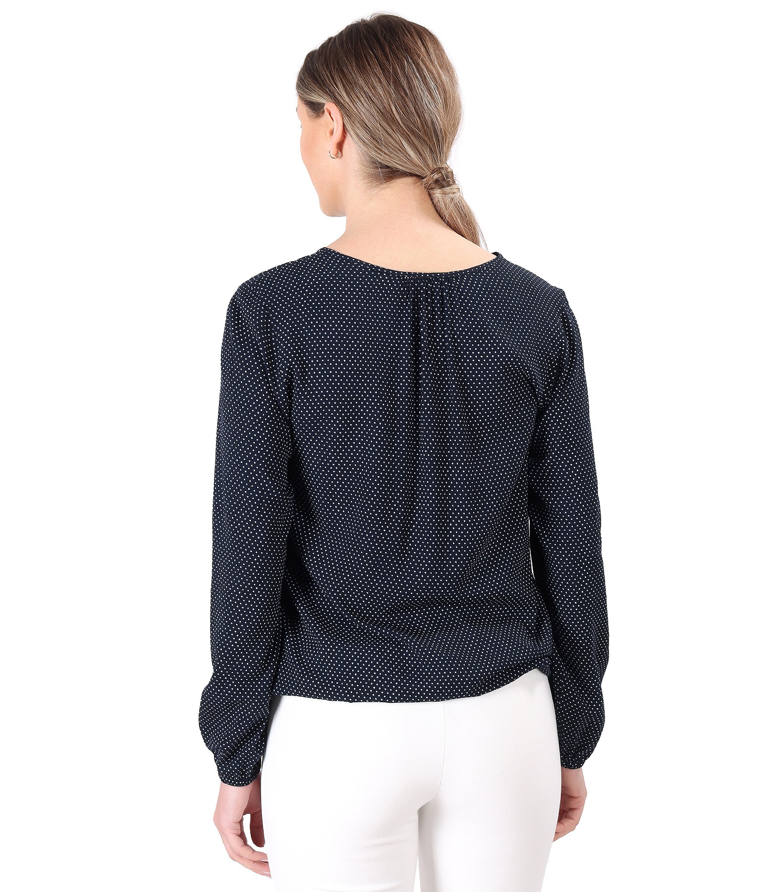 Bluza eleganta din viscoza imprimata cu picouri, cu maneci lungi cu elastic, cu decolteu rotund si terminatie elastica in talie. Se inchide cu un nasture tip perla pe mijloc fata.