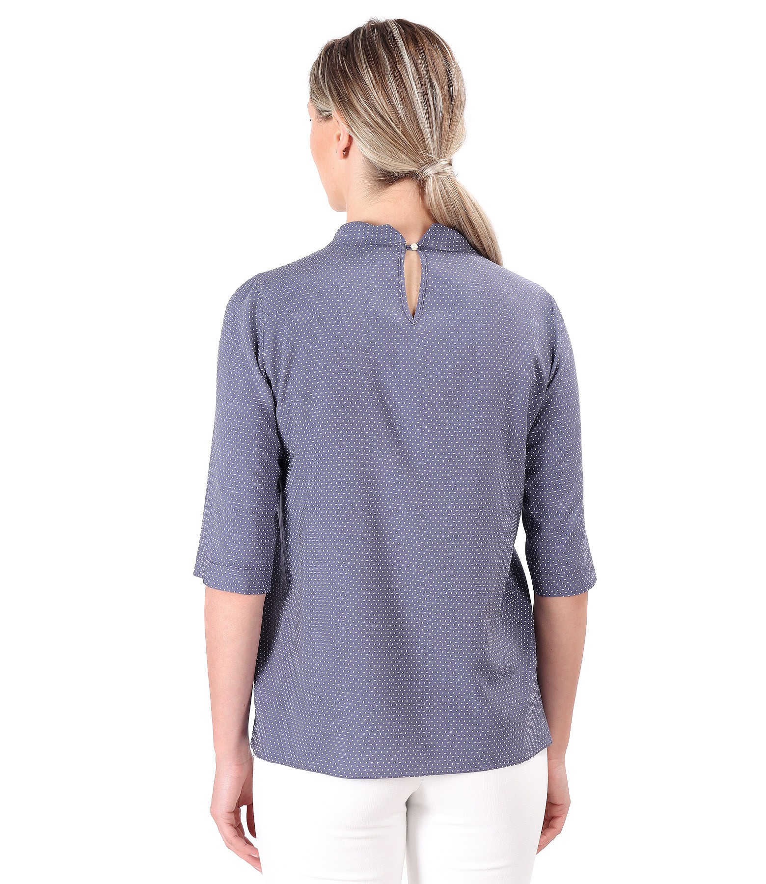 Bluza din viscoza imprimata cu picouri, cu maneci 3/4, cu fald pe mijloc fata si decolteu rotund cu element decorativ. Se inchide cu un nasture pe mijloc spate.