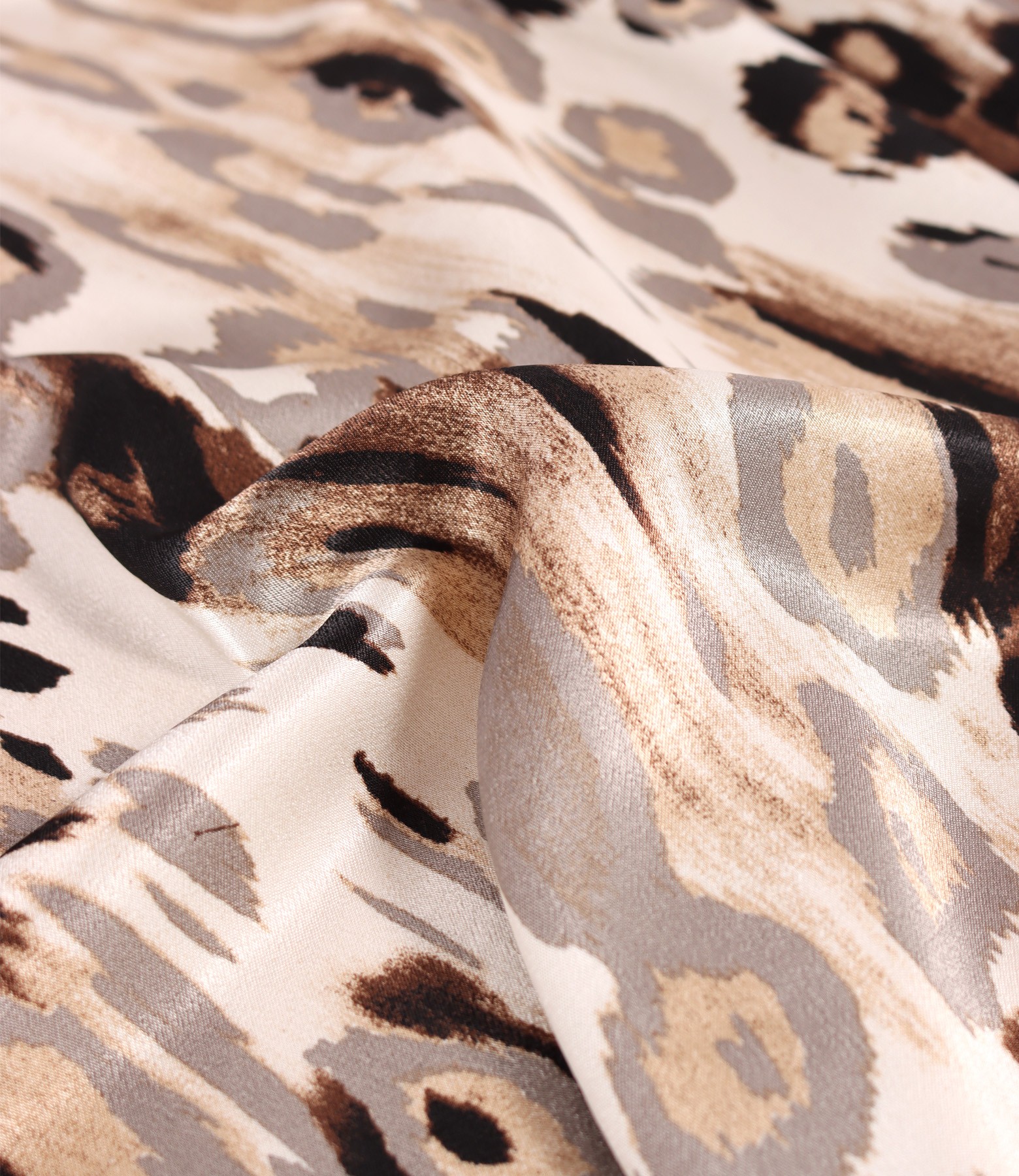 Bluza din viscoza satinata cu animal print, maneci 3/4, cu fald pe mijloc fata si guler rotund. Se inchide cu un nasture pe mijloc spate. Pozitia imprimeului variaza per produs.
