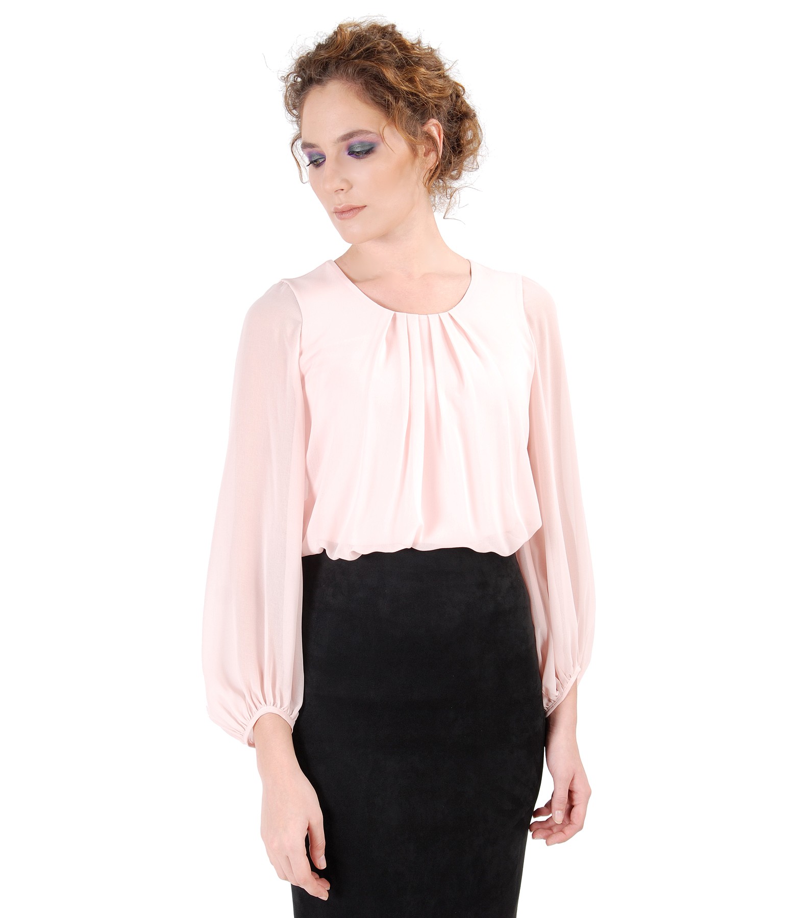 Bluza lejera din voal, dublata cu viscoza, cu maneci bufante si falduri pe fata.