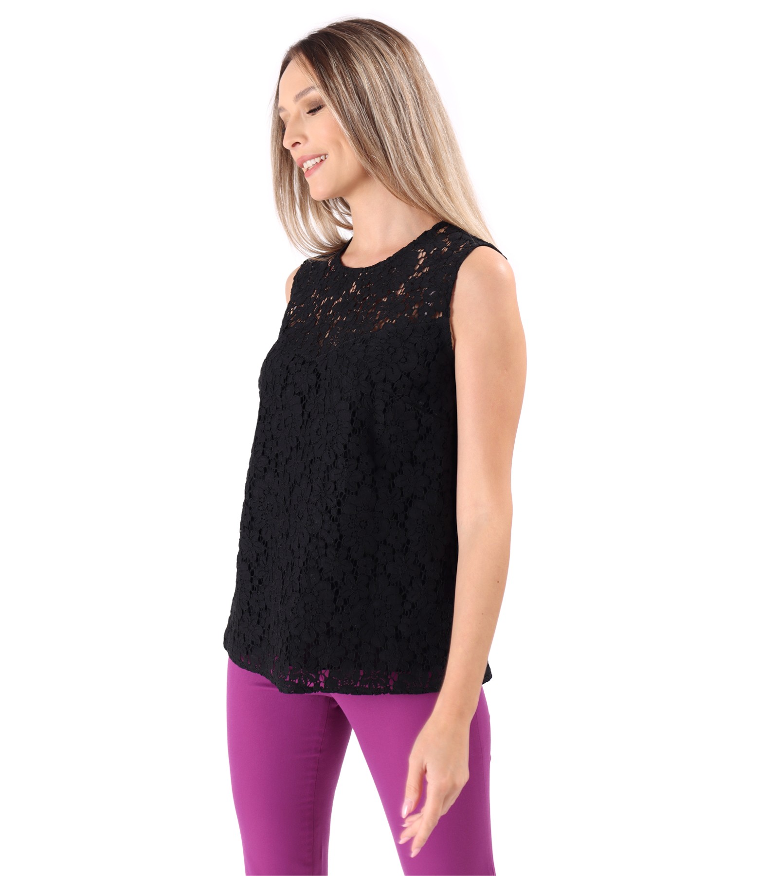 Bluza eleganta din dantela plina cu bumbac cu motive florale, dublata cu viscoza, fara maneci si cu decolteu rotund. Se inchide cu fermoar ascuns pe mijloc spate.