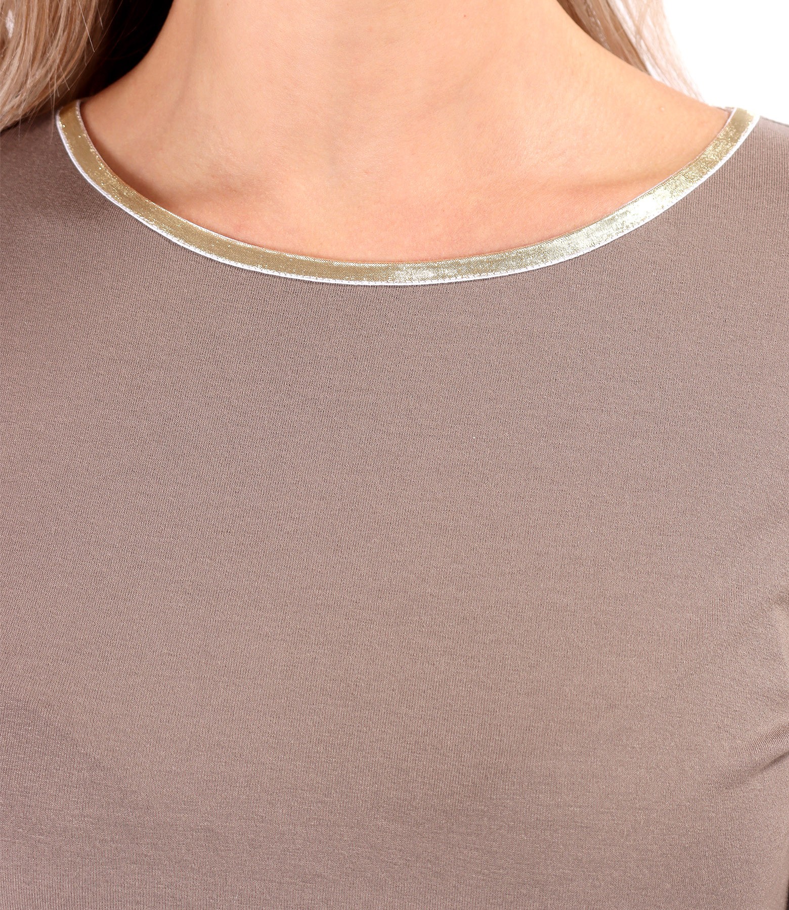 Bluza eleganta din jerse elastic de viscoza, cu maneci 3/4 si decolteu rotund cu garnitura din elastic auriu.