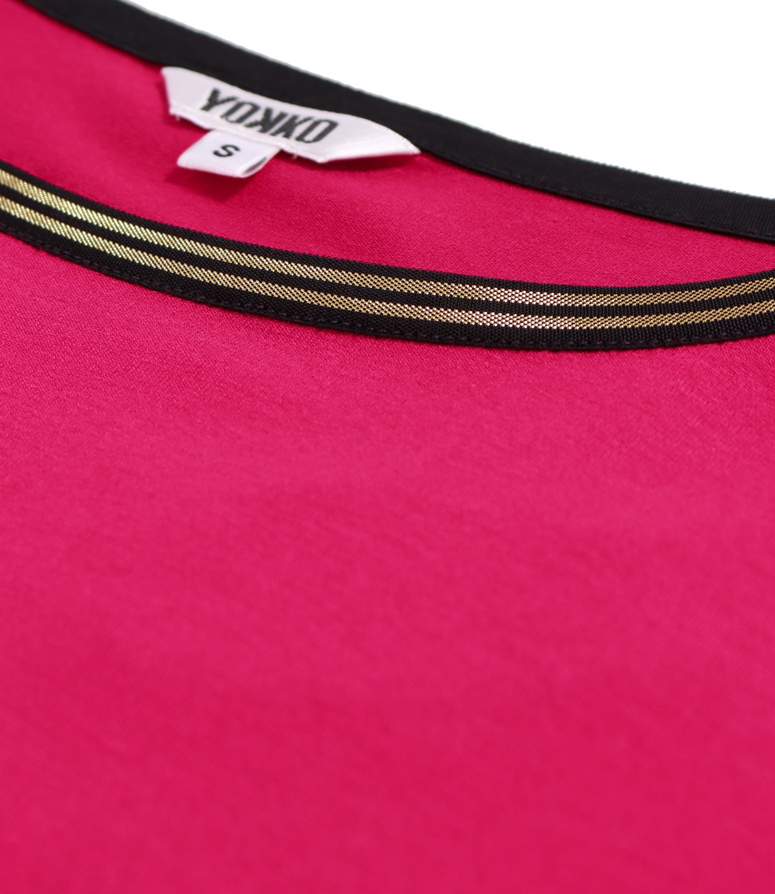 Bluza eleganta din jerse elastic de viscoza, cu maneci 3/4 si decolteu rotund cu garnitura din elastic auriu.
