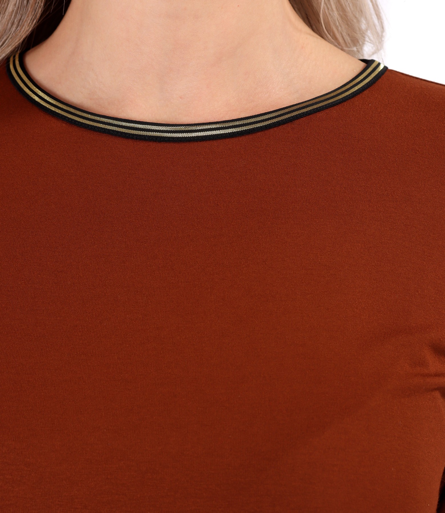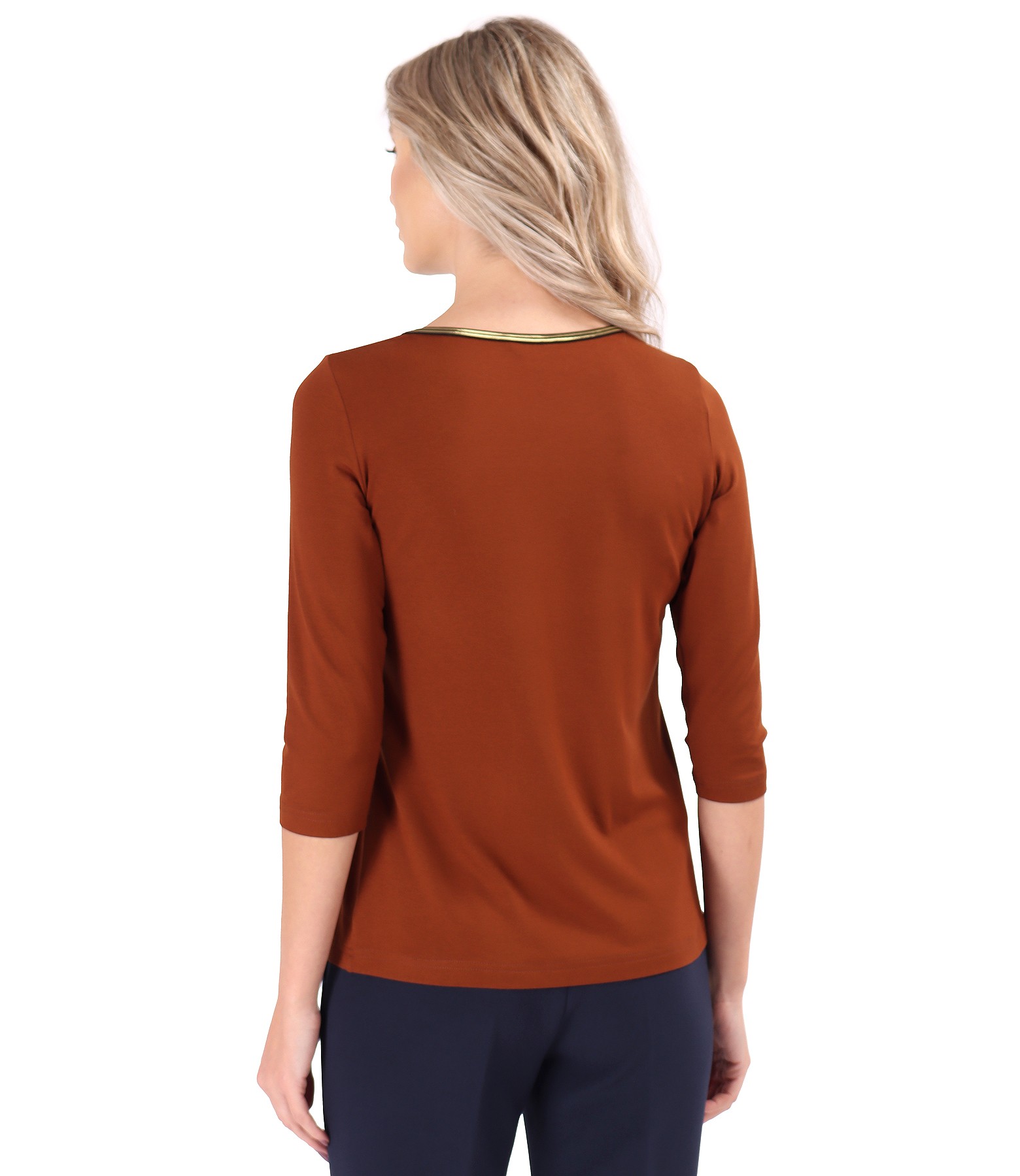 Bluza eleganta din jerse elastic de viscoza, cu maneci 3/4 si decolteu rotund cu garnitura din elastic auriu.
