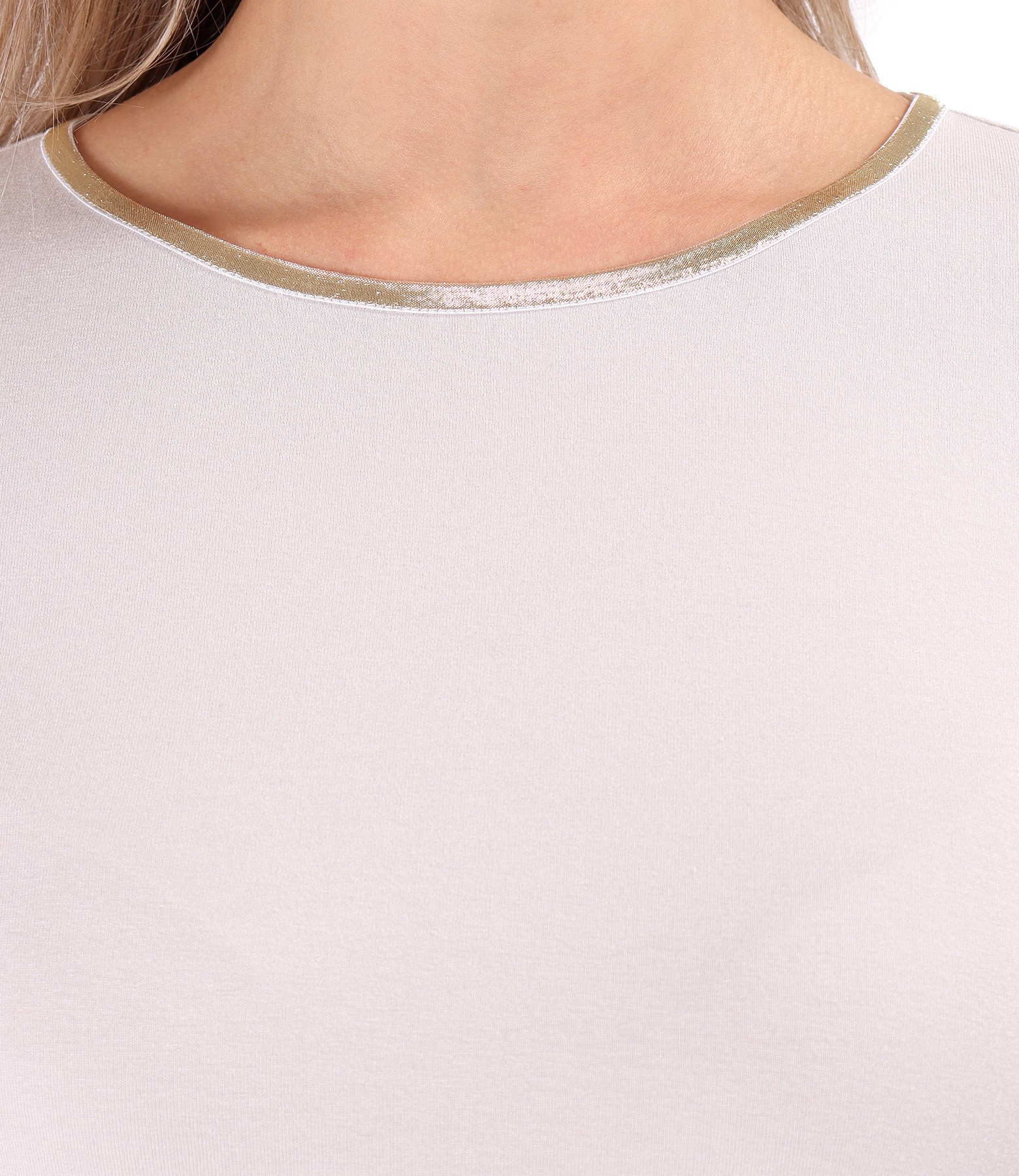 Bluza eleganta din jerse elastic de viscoza, cu maneci 3/4 si decolteu rotund cu garnitura din elastic auriu.