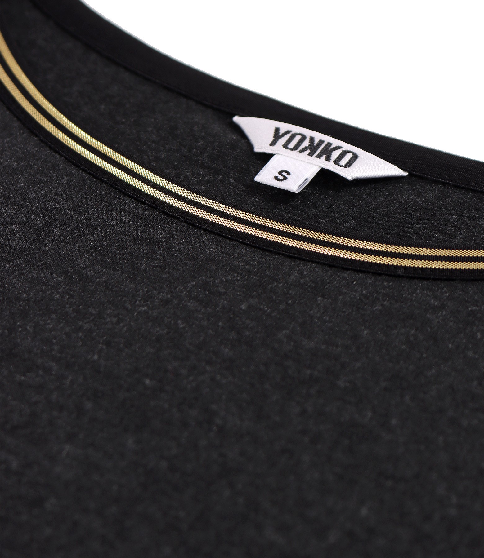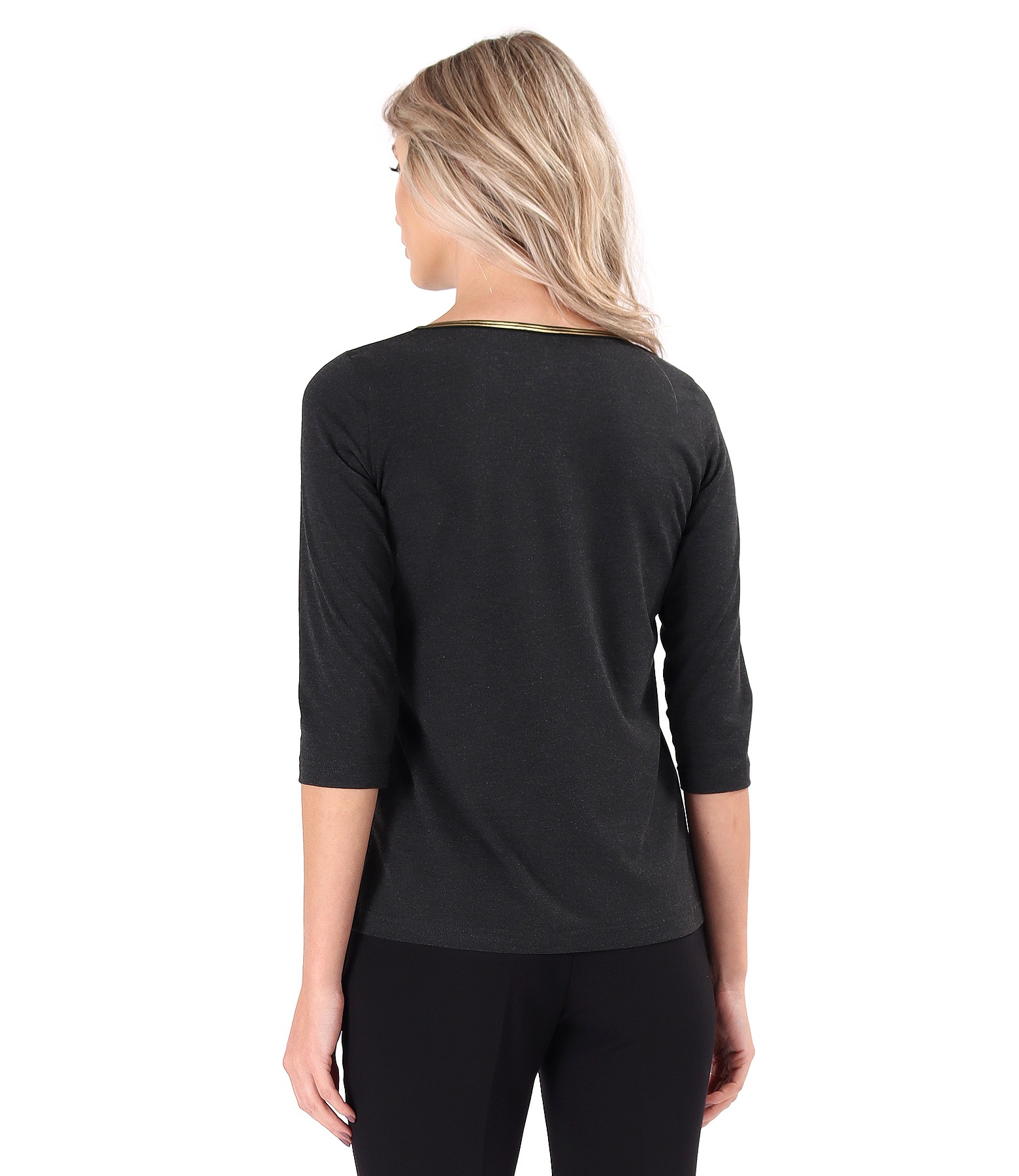 Bluza eleganta din jerse elastic de viscoza, cu maneci 3/4 si decolteu rotund cu garnitura din elastic auriu.