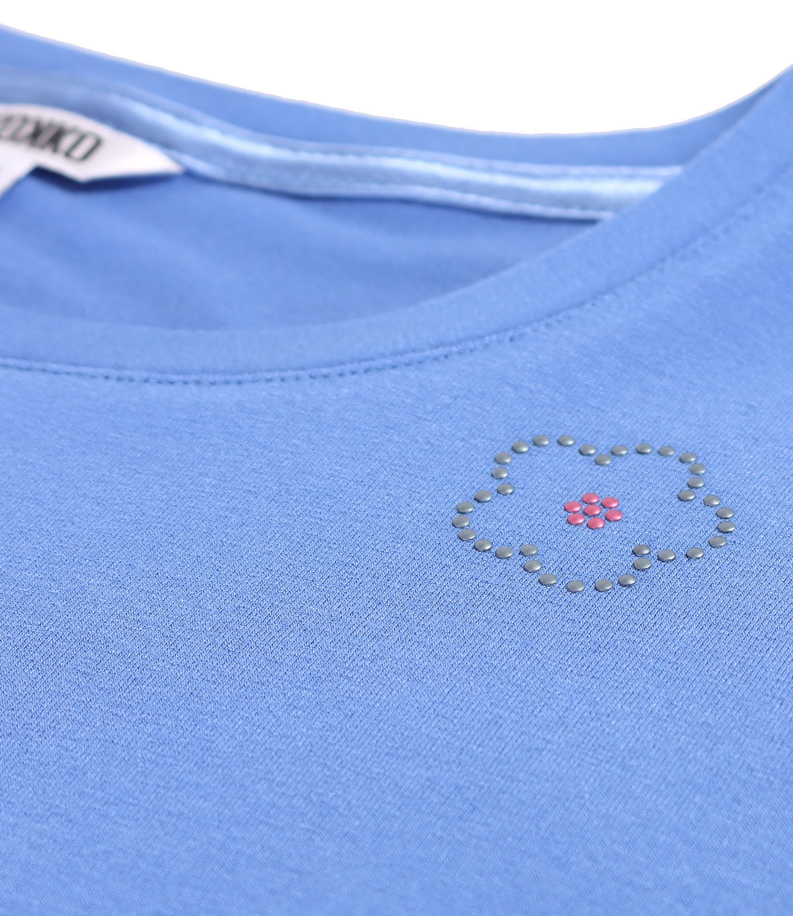 Bluza eleganta din jerse elastic cu maneci scurte ample, decolteu rotund cu aplicatie decorativa in forma de floare.