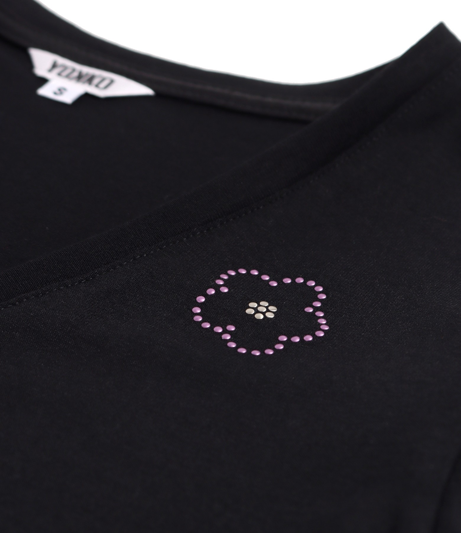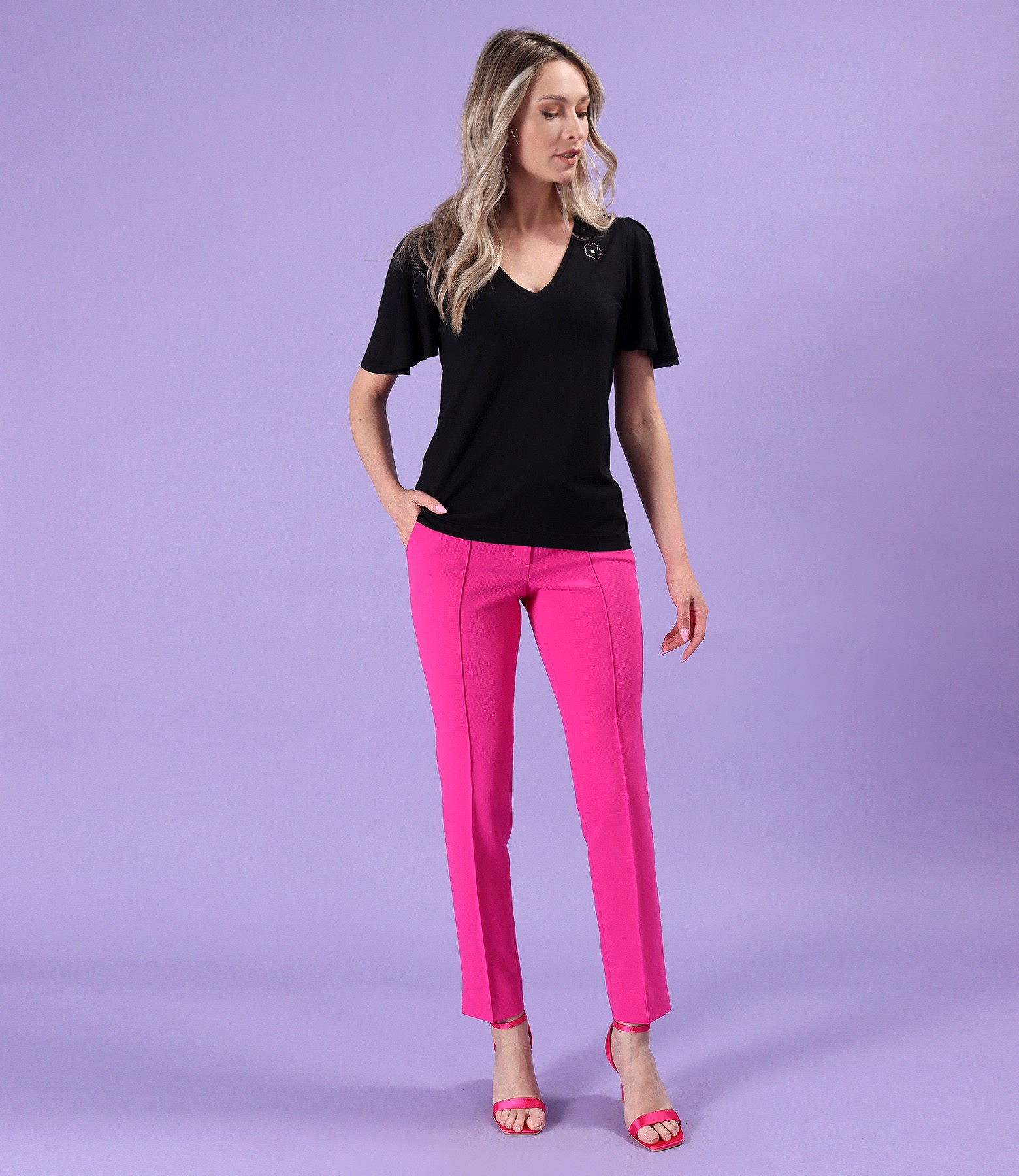 Bluza eleganta din jerse elastic cu maneci scurte ample, decolteu in V cu aplicatie decorativa in forma de floare.