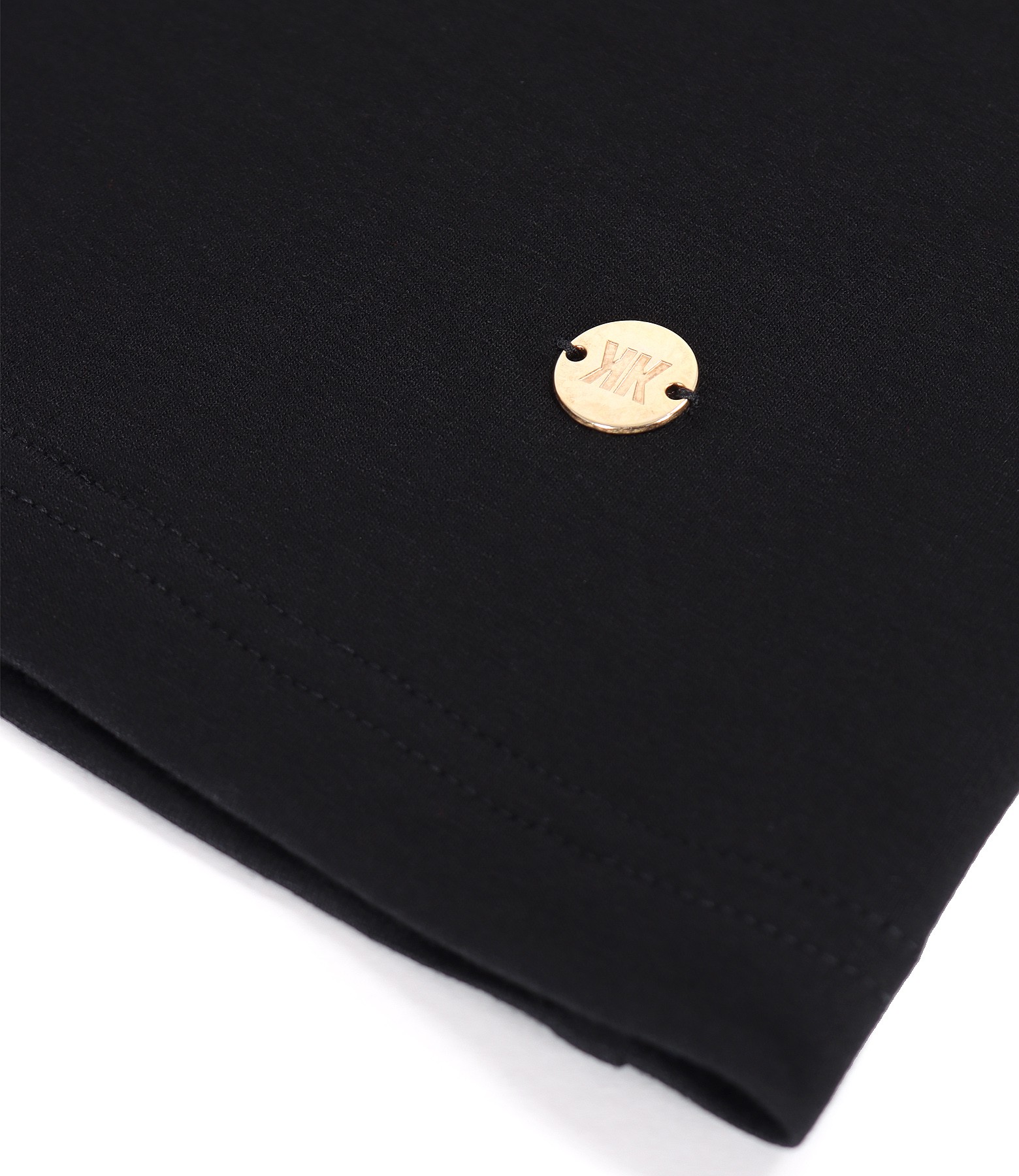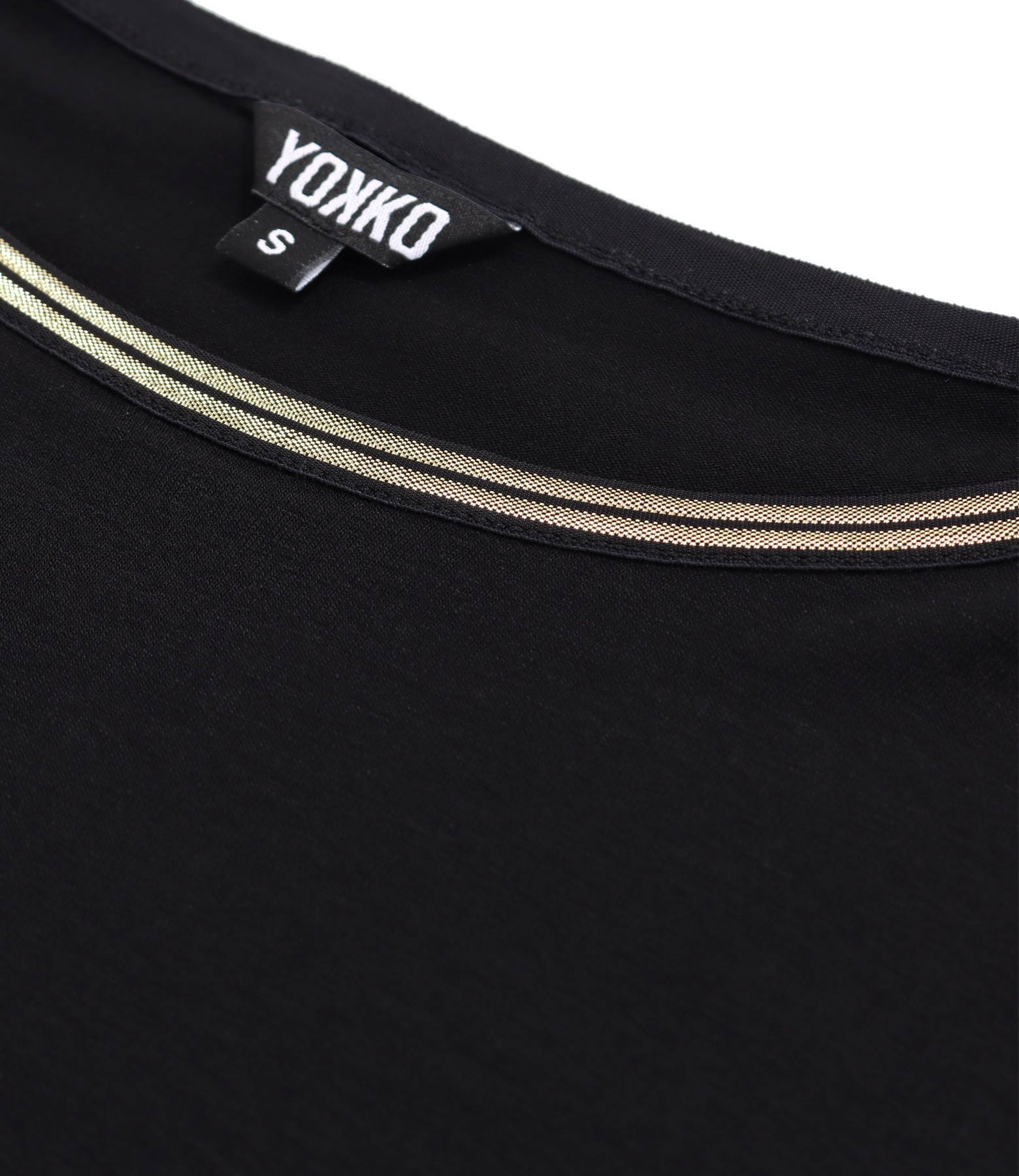 Bluza eleganta din jerse elastic fin, cu maneci 3/4 si decolteu rotund cu garnitura din elastic auriu.