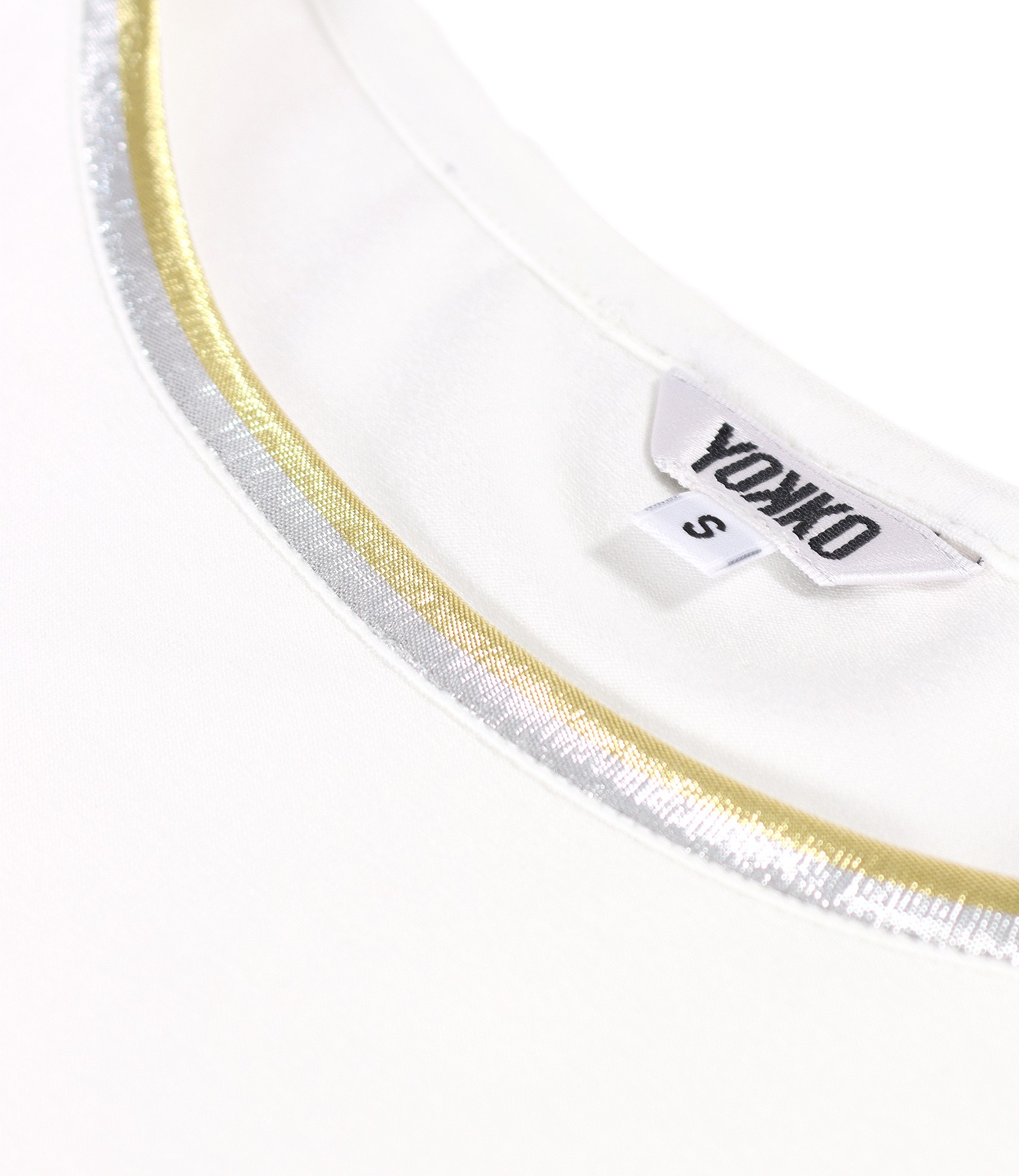 Bluza eleganta din jerse elastic fin, cu maneci scurte si decolteu rotund cu garnitura din elastic auriu.