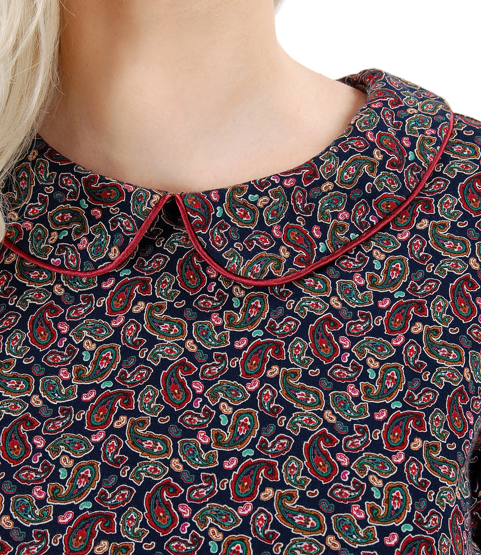 Bluza eleganta din jerse elastic imprimat cu motive florale, cu maneci 3/4 si cu guler rotunjit cu garnitura contrast. Se inchide cu un nasture pe spate.