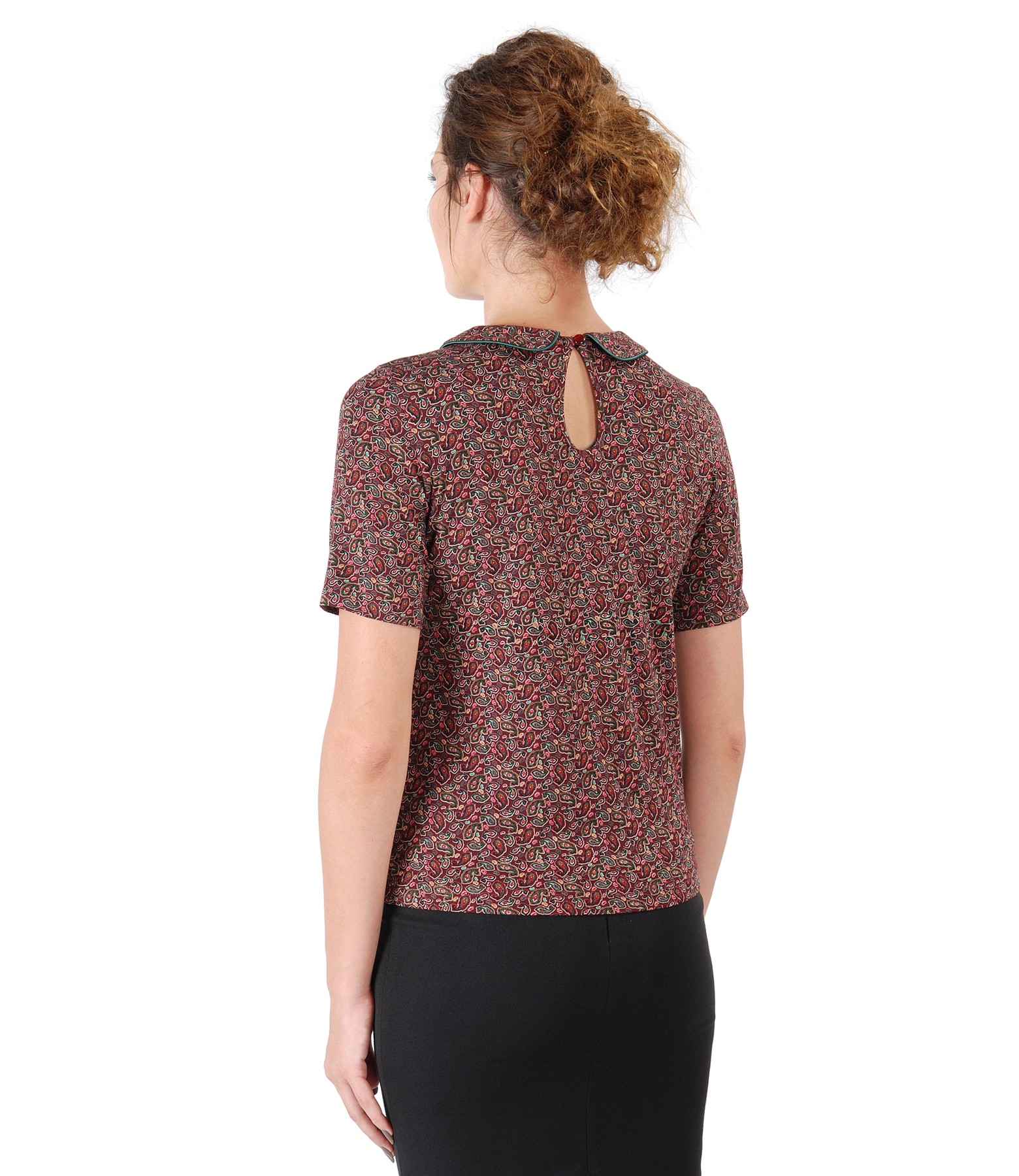 Bluza eleganta din jerse elastic imprimat cu motive florale, cu maneci scurte si cu guler rotunjit cu garnitura contrast. Se inchide cu un nasture pe spate.