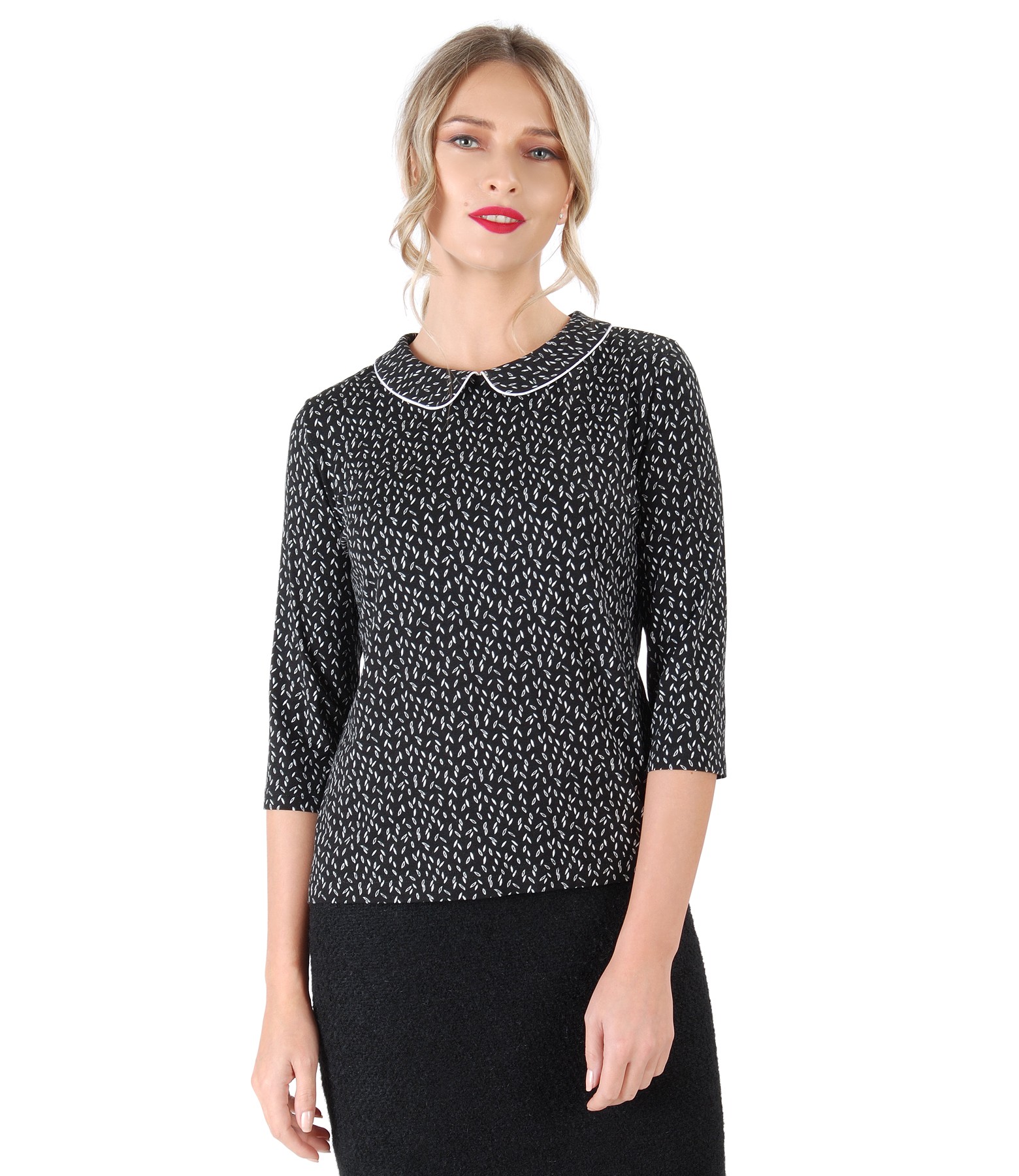 Bluza eleganta din jerse elastic imprimat, cu maneci 3/4 si cu guler rotunjit cu garnitura contrast. Se inchide cu un nasture pe spate.