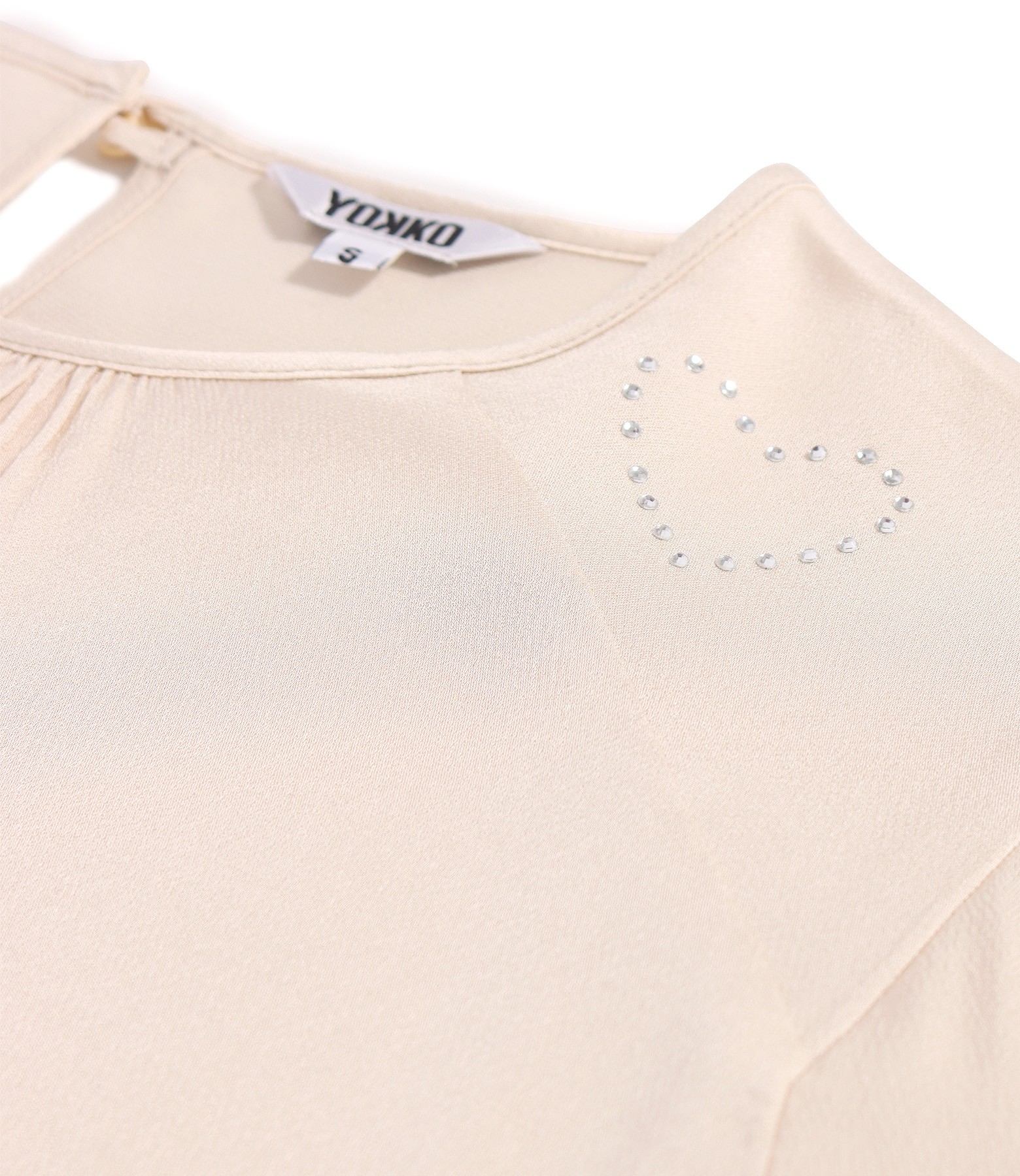 Bluza eleganta din viscoza usor satinata, cu maneci lungi cu elastic, cu terminatie elastica in talie si aplicatie decorativa in forma de inima pe platca umar. Se inchide cu un nasture tip cristal pe mijloc spate.