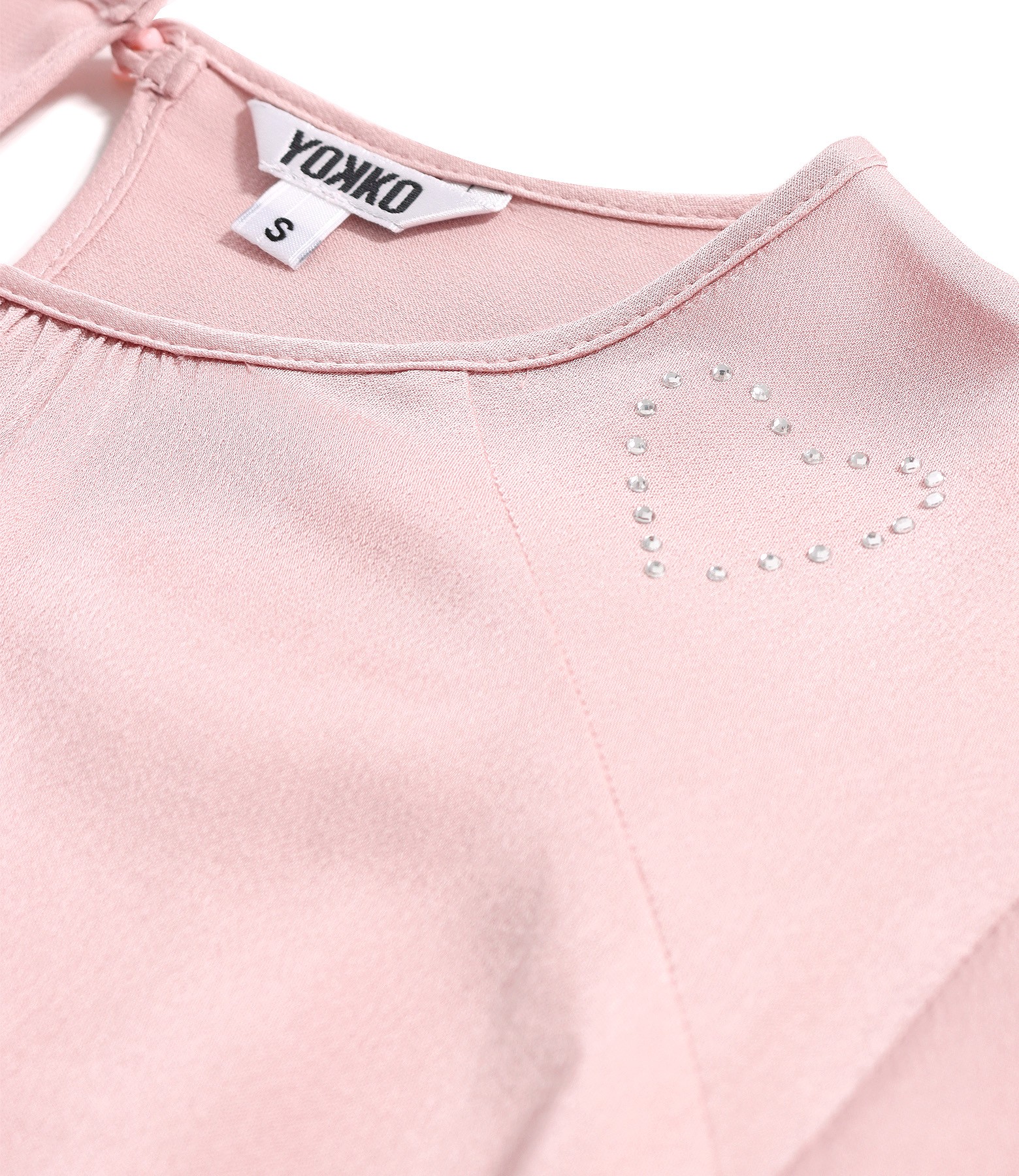 Bluza eleganta din viscoza usor satinata, cu maneci lungi cu elastic, cu terminatie elastica in talie si aplicatie decorativa in forma de inima pe platca umar. Se inchide cu un nasture pe mijloc spate.