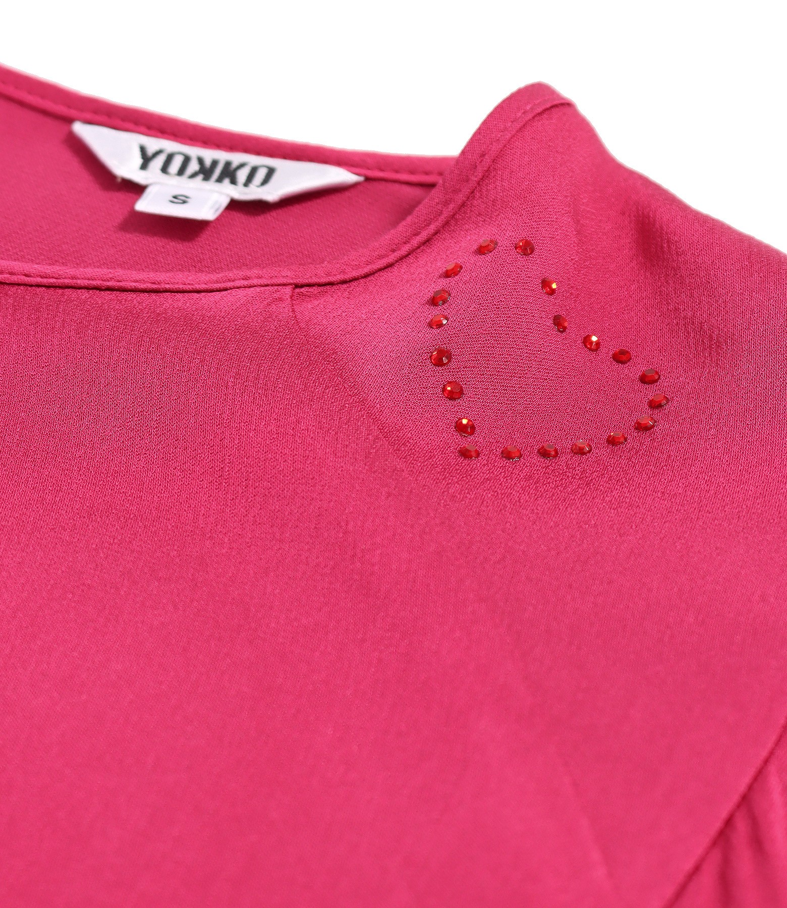 Bluza eleganta din viscoza usor satinata, cu maneci lungi cu elastic, cu terminatie elastica in talie si aplicatie decorativa in forma de inima pe platca umar. Se inchide cu un nasture pe mijloc spate.