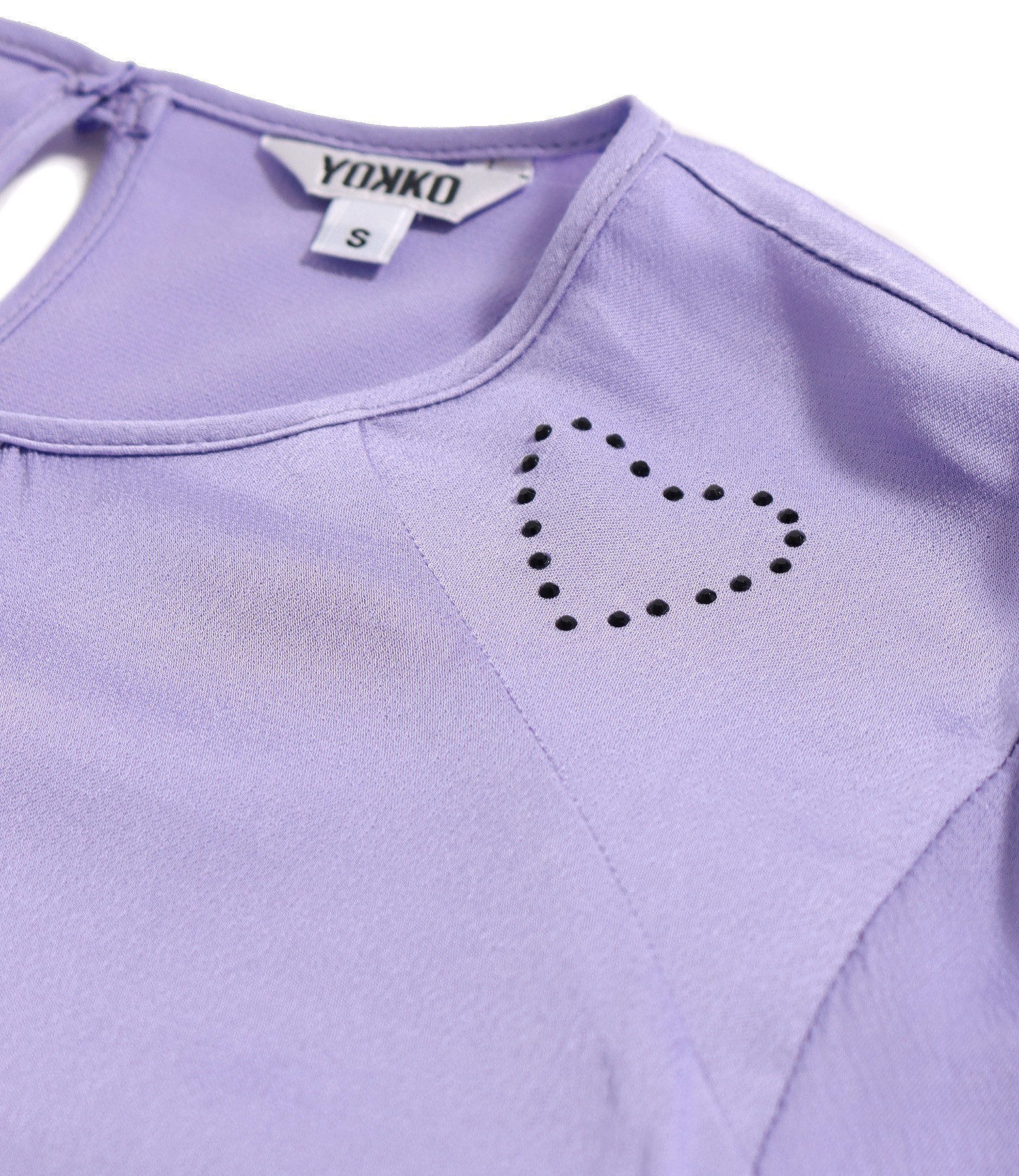 Bluza eleganta din viscoza usor satinata, cu maneci lungi cu elastic, cu terminatie elastica in talie si aplicatie decorativa in forma de inima pe platca umar. Se inchide cu un nasture pe mijloc spate.