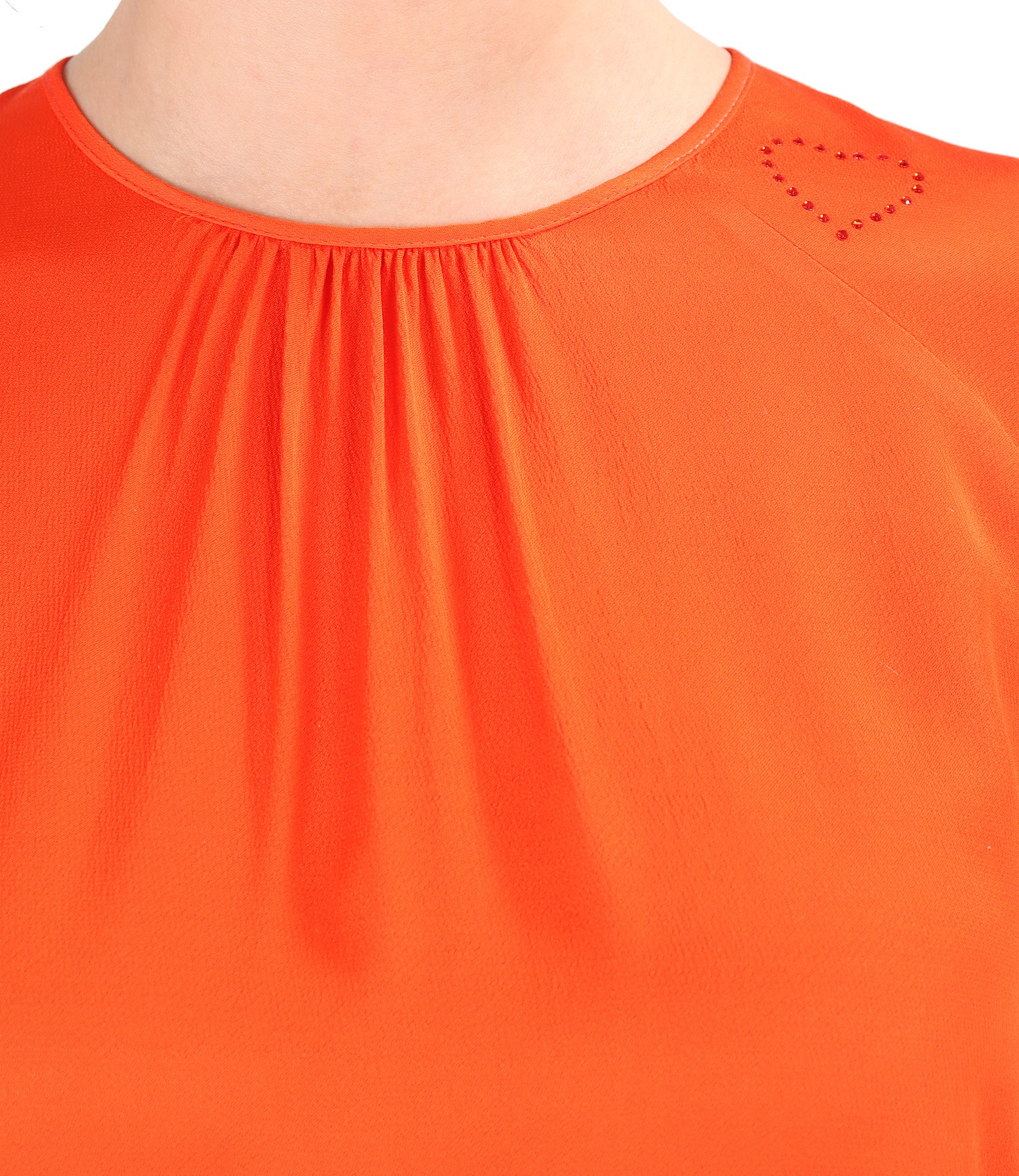 Bluza eleganta din viscoza usor satinata, cu maneci lungi cu elastic, cu terminatie elastica in talie si aplicatie decorativa in forma de inima pe platca umar. Se inchide cu un nasture pe mijloc spate.