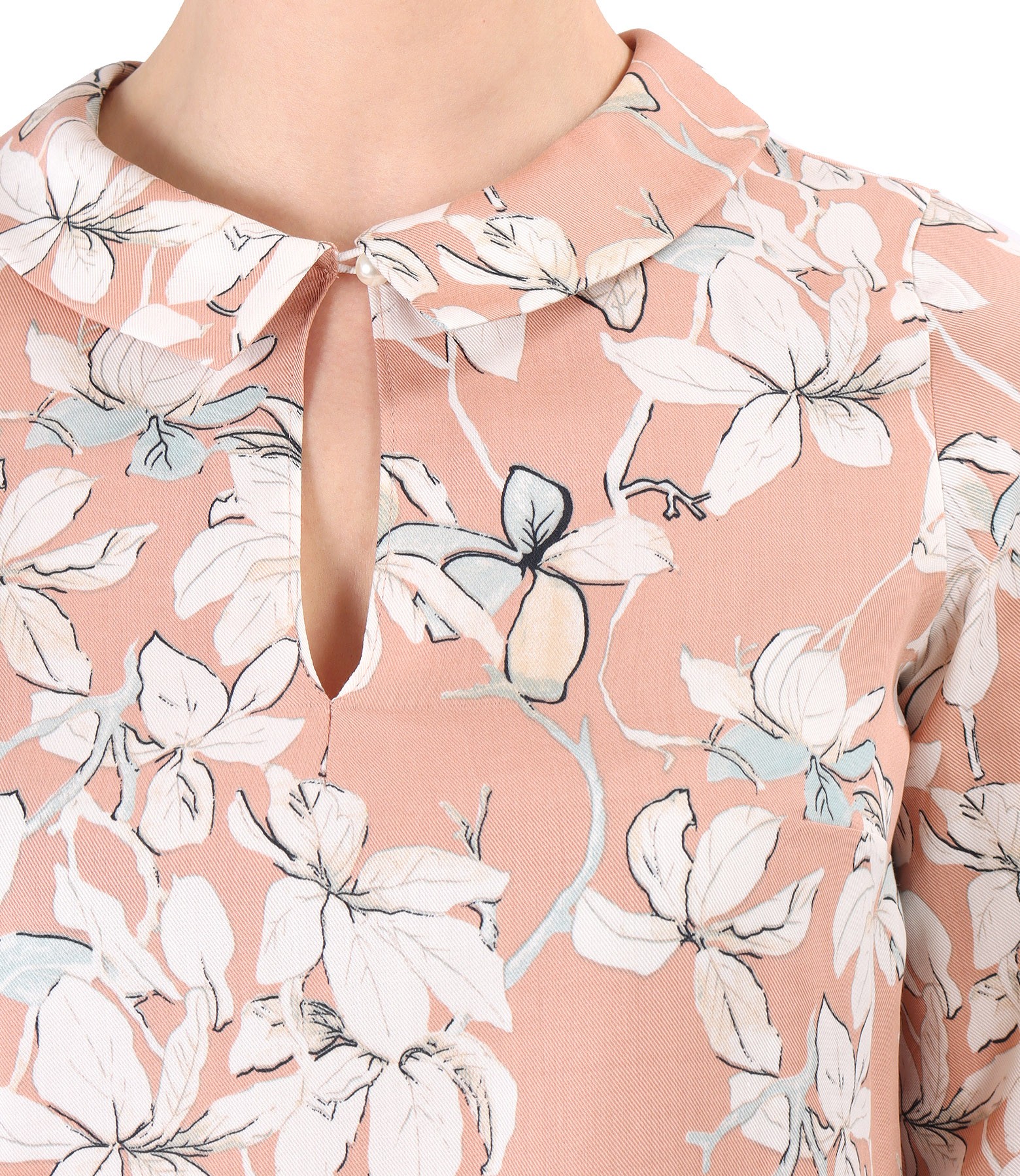 Bluza eleganta din tencel imprimat cu motive florale, maneci 3/4 si guler ascutit inchis cu perla pe fata.